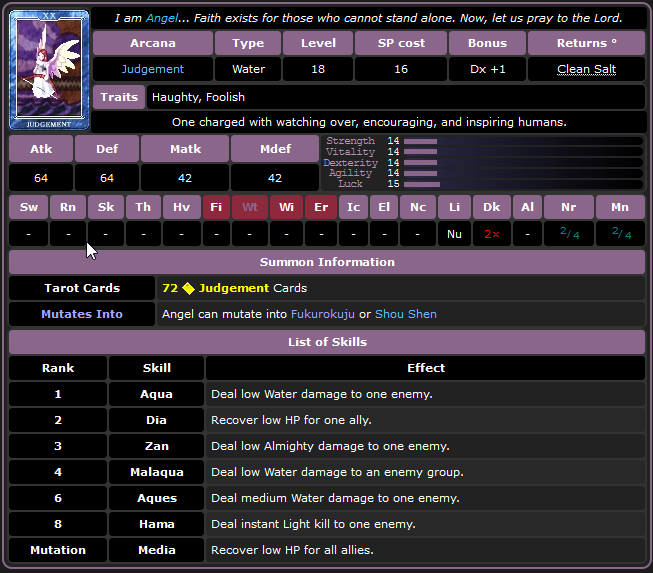 : Meet the Persona 2 Angel design, also known as Elly from Persona 1 if she was in a mainline SMT game. This is well before SMT Nocturne and the infamous “bondage angel” that has been in every SMT game since the PS2 era. We want Angel for one reason and one reason alone: I had to change Maya’s Persona and without Pixie we’d have no source of healing.