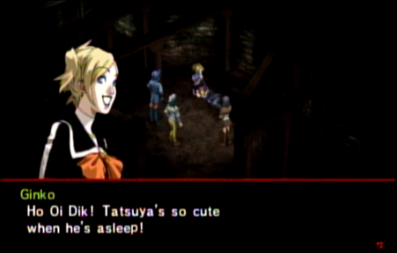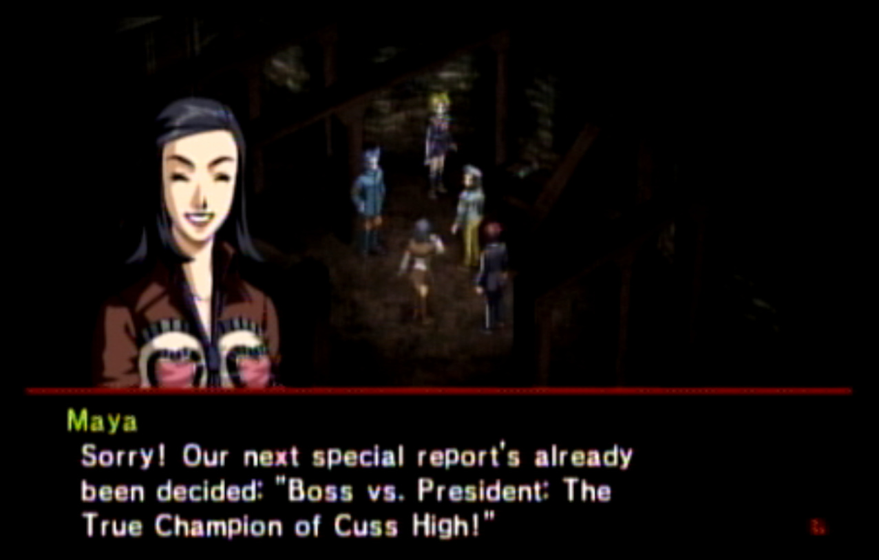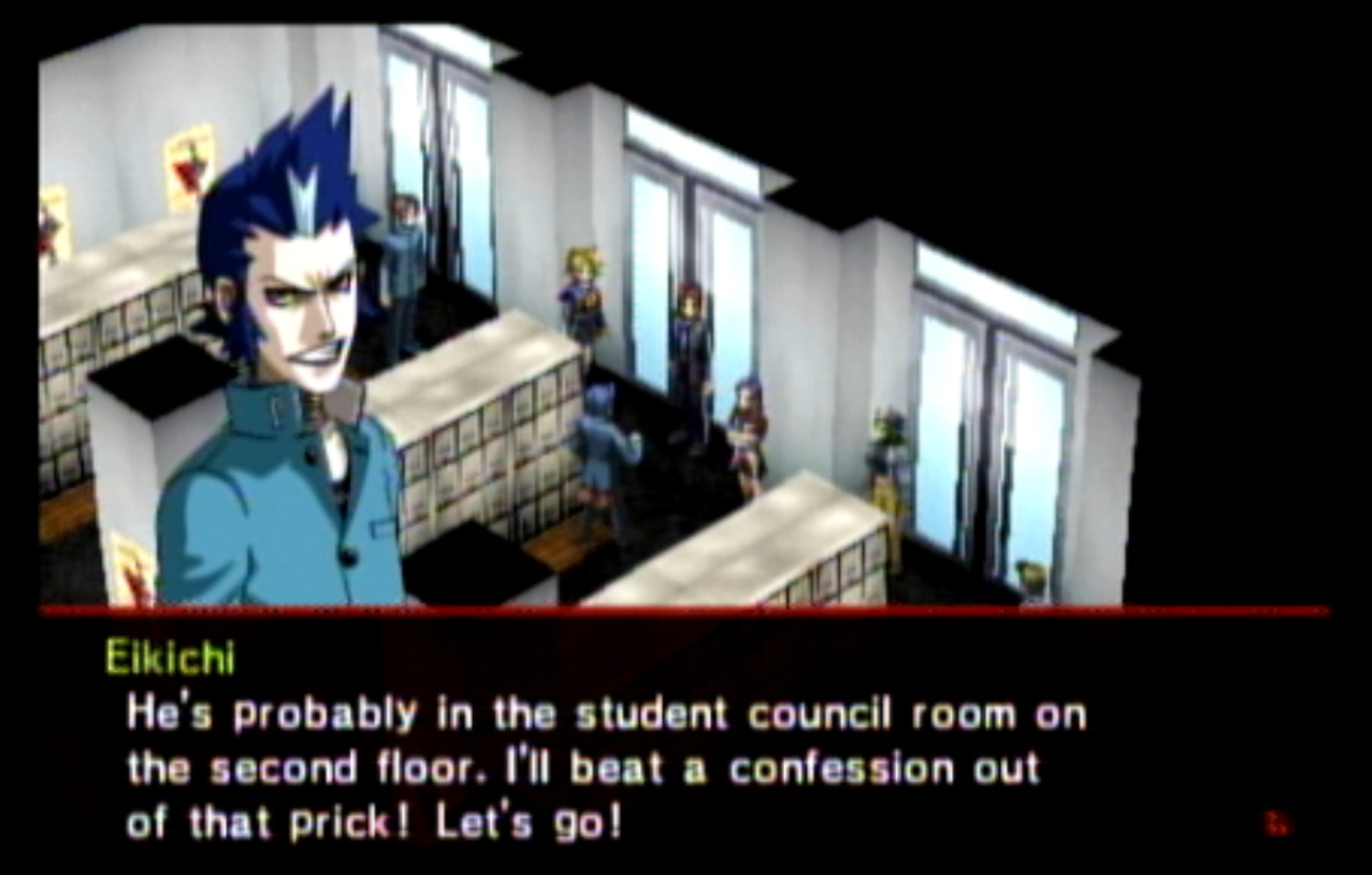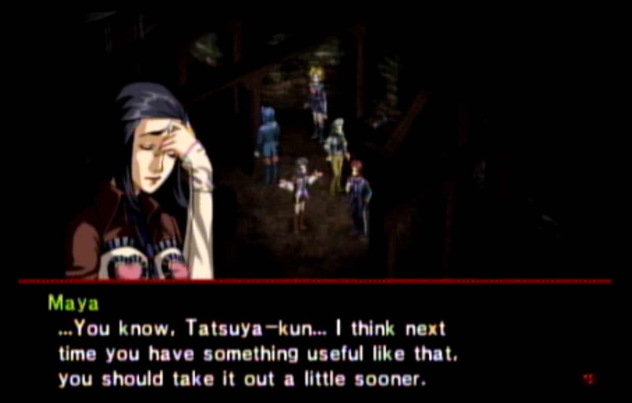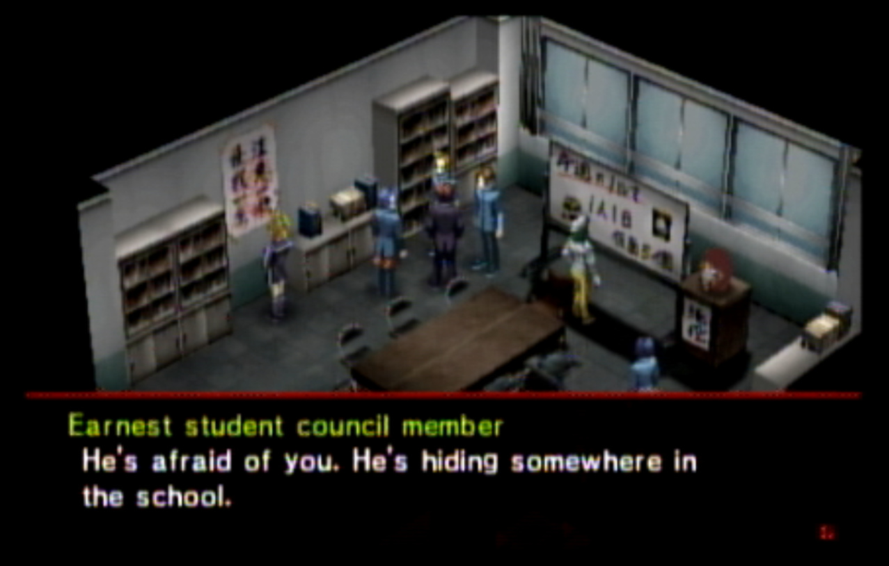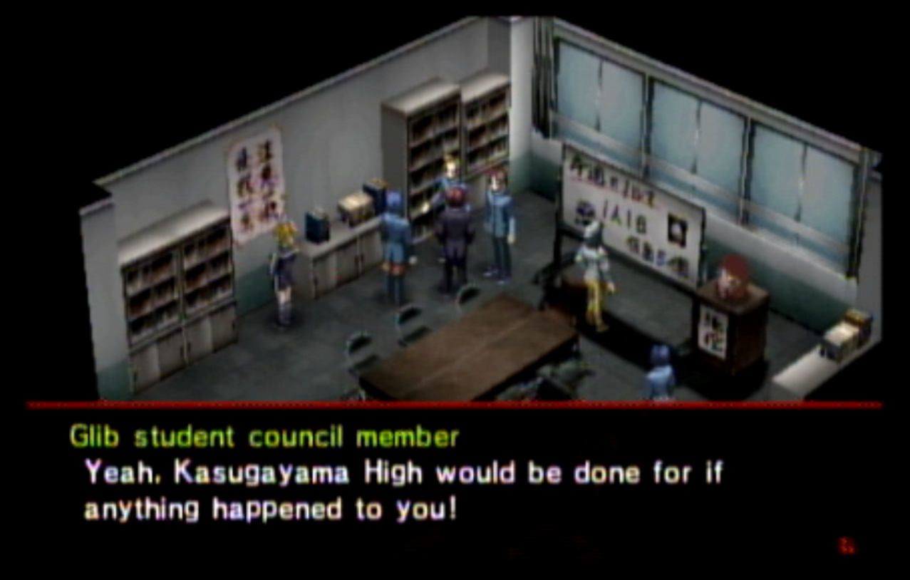: You’ll notice that none of the Personas in Persona 2 use the old art from the SNES games or Devil Summoner. I have no idea why Atlus did this and then re-used the shit out of Nocturne’s models in Persona 3 and 4. : We can only hold a total of 10 personas, and that counts the five we have equipped. The guide for this game says you want to equip Pixie to Tatsuya. That’s wrong. You want to equip it to Maya, because her Persona SUCKS. : Most of the rooms are exactly the same: you go into the room, smash the clock, and either a party member or an NPC will confirm you’ve smashed the clock. 1-D is a bit different though: I think because the developers assumed you would do the rooms starting from the principal’s office on the third floor and working your way down. : This line is super awkward.