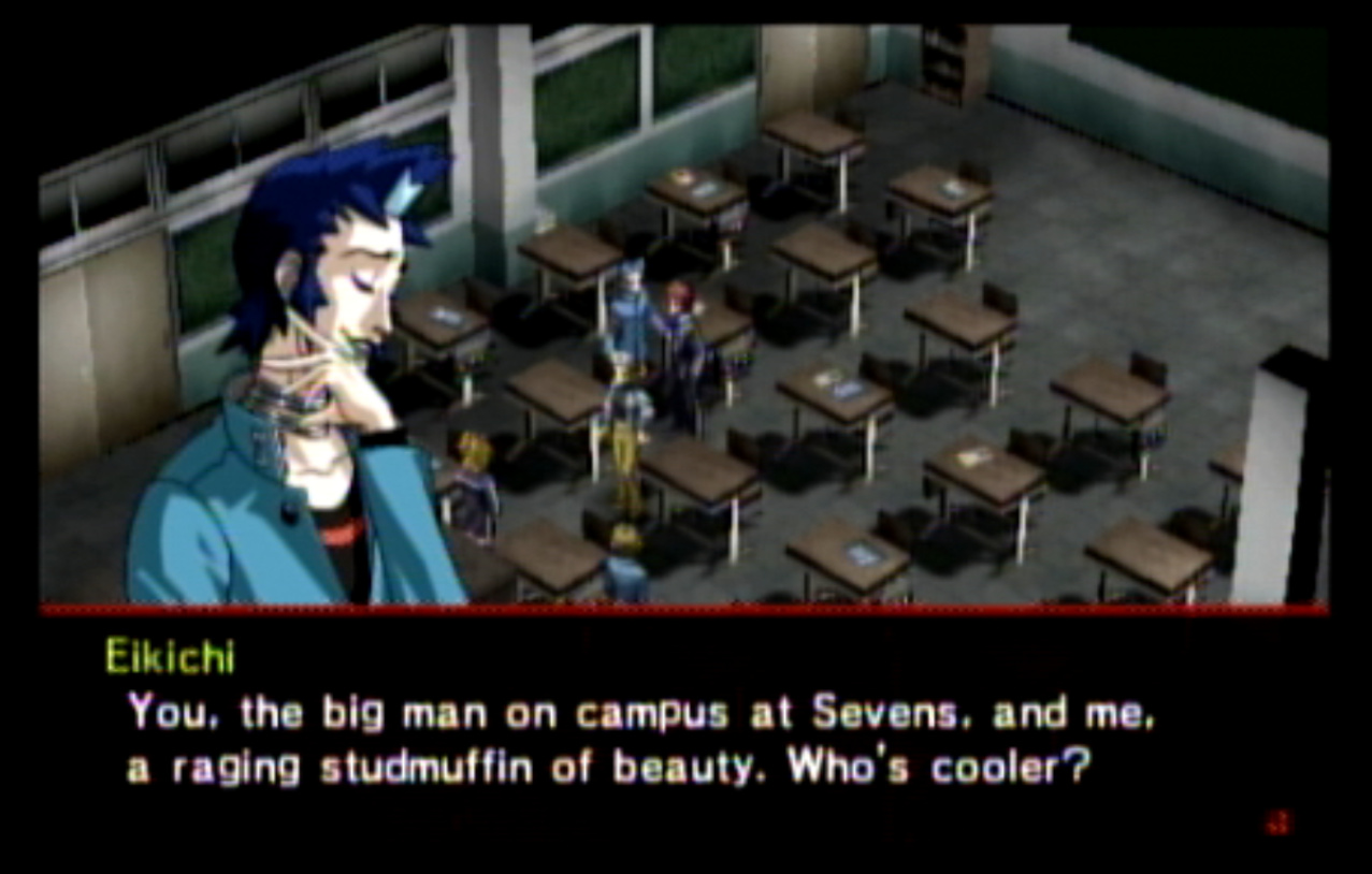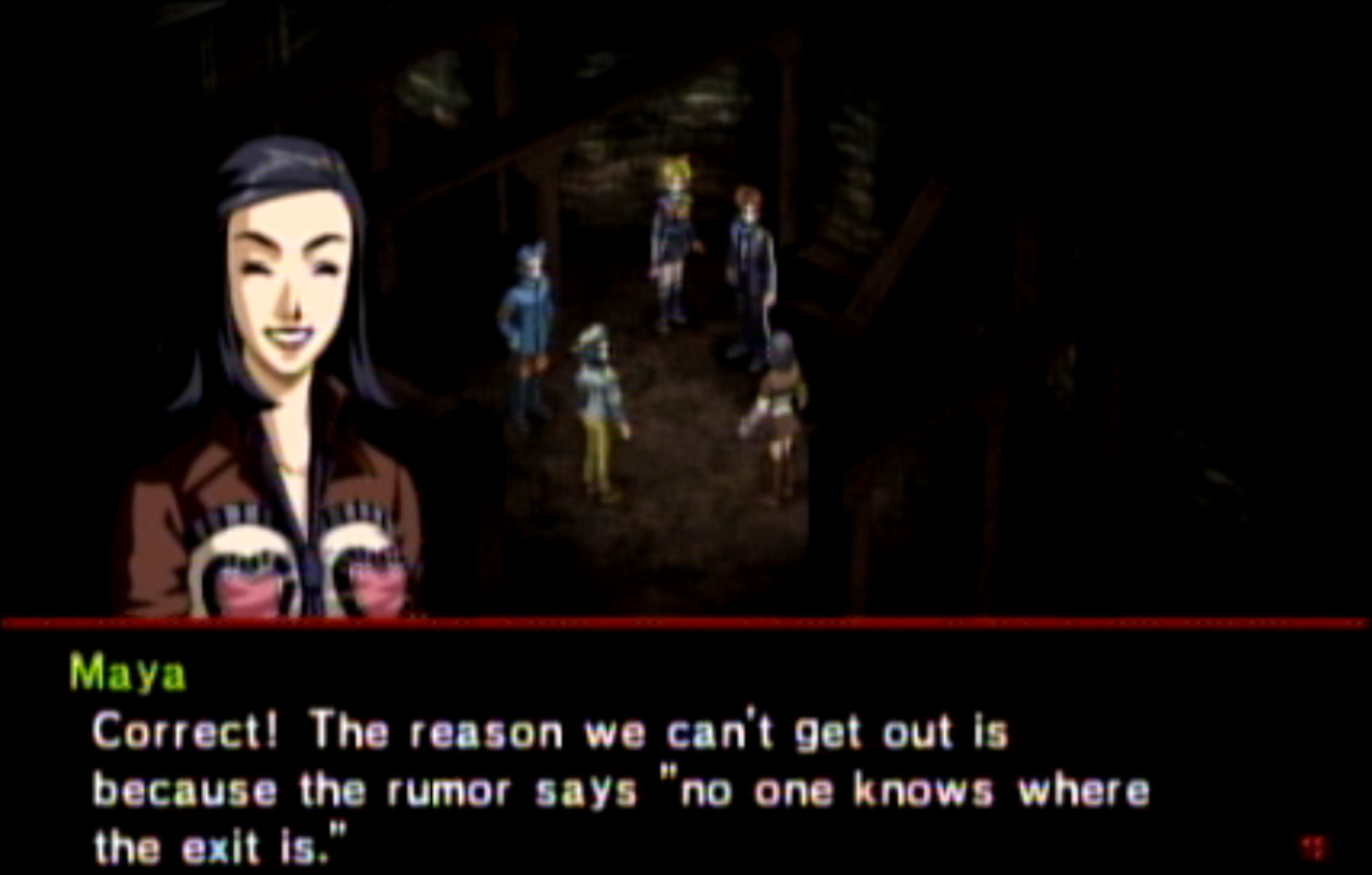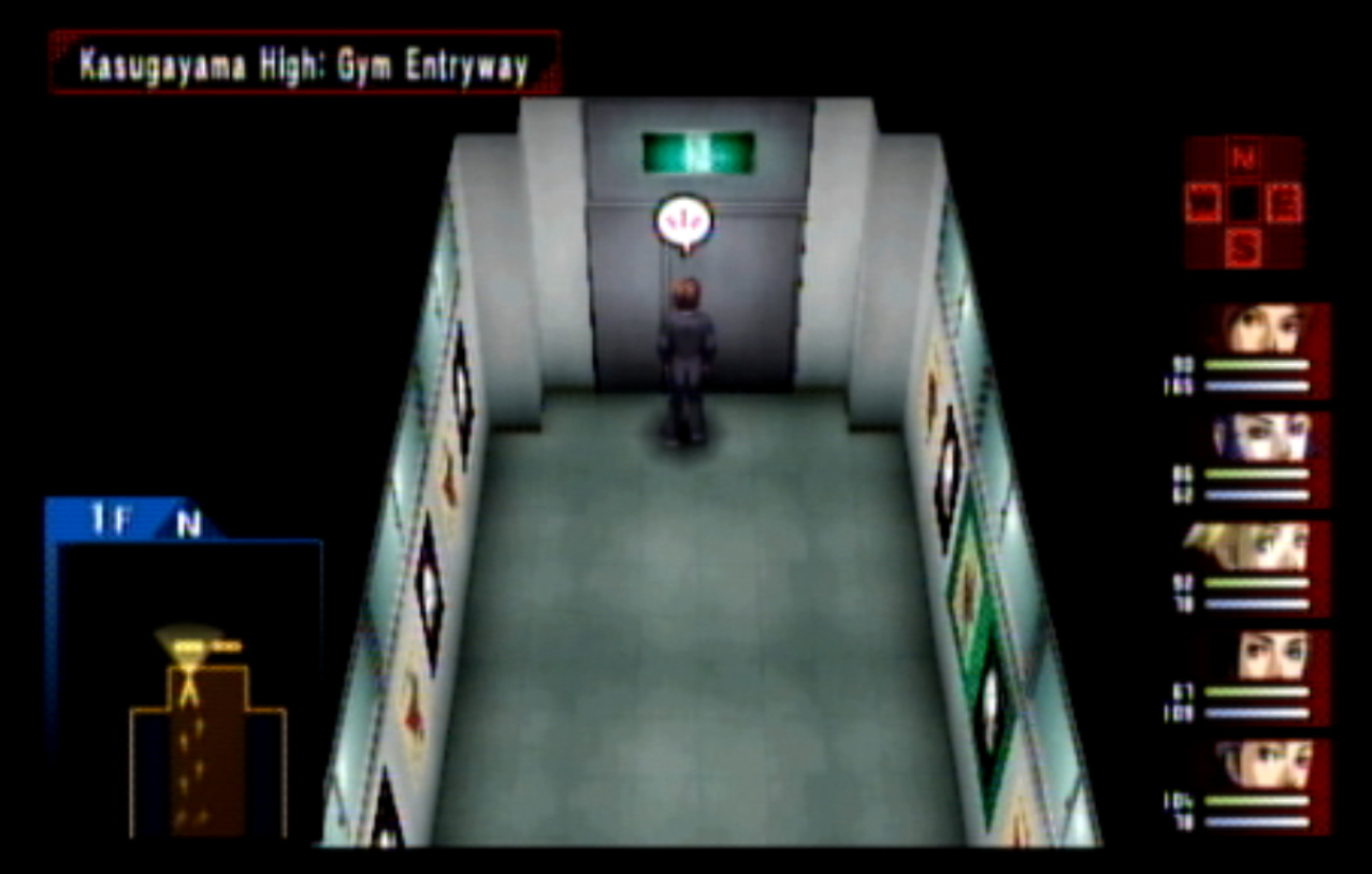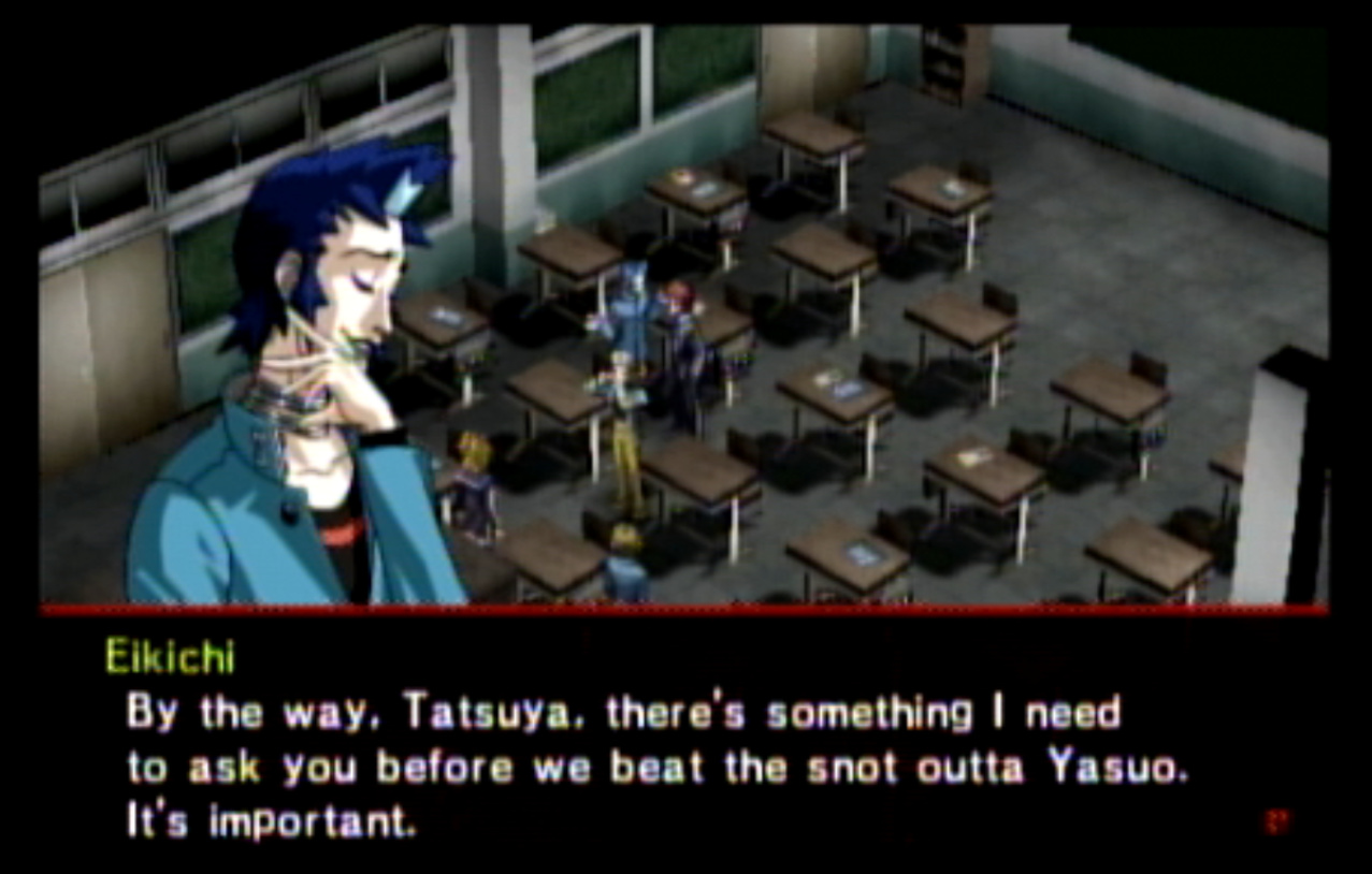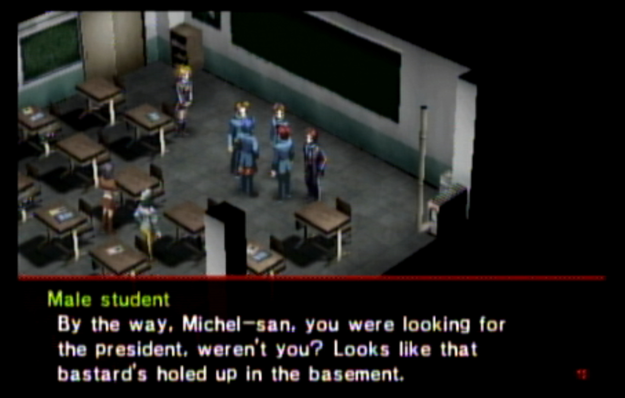 : You’ll notice that none of the Personas in Persona 2 use the old art from the SNES games or Devil Summoner. I have no idea why Atlus did this and then re-used the shit out of Nocturne’s models in Persona 3 and 4. : We can only hold a total of 10 personas, and that counts the five we have equipped. The guide for this game says you want to equip Pixie to Tatsuya. That’s wrong. You want to equip it to Maya, because her Persona SUCKS. : Most of the rooms are exactly the same: you go into the room, smash the clock, and either a party member or an NPC will confirm you’ve smashed the clock. 1-D is a bit different though: I think because the developers assumed you would do the rooms starting from the principal’s office on the third floor and working your way down. : This line is super awkward.