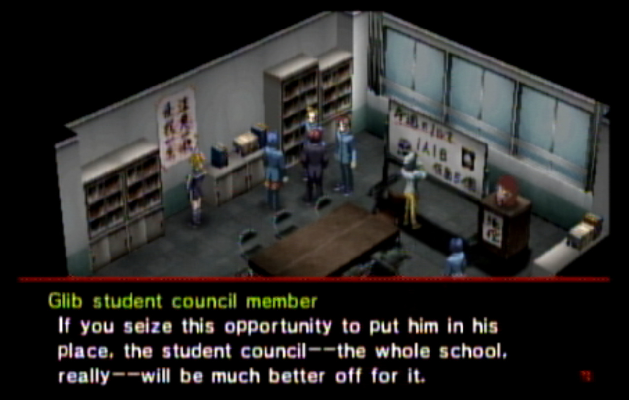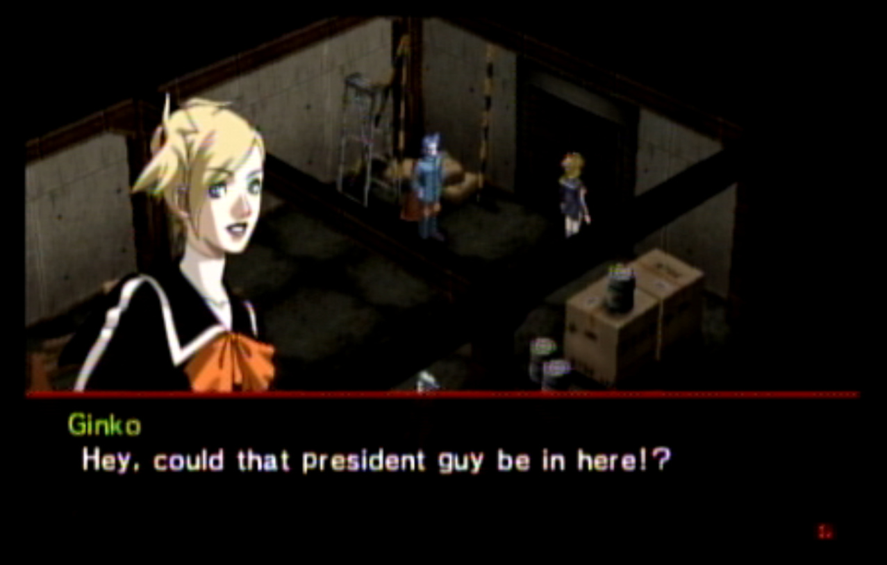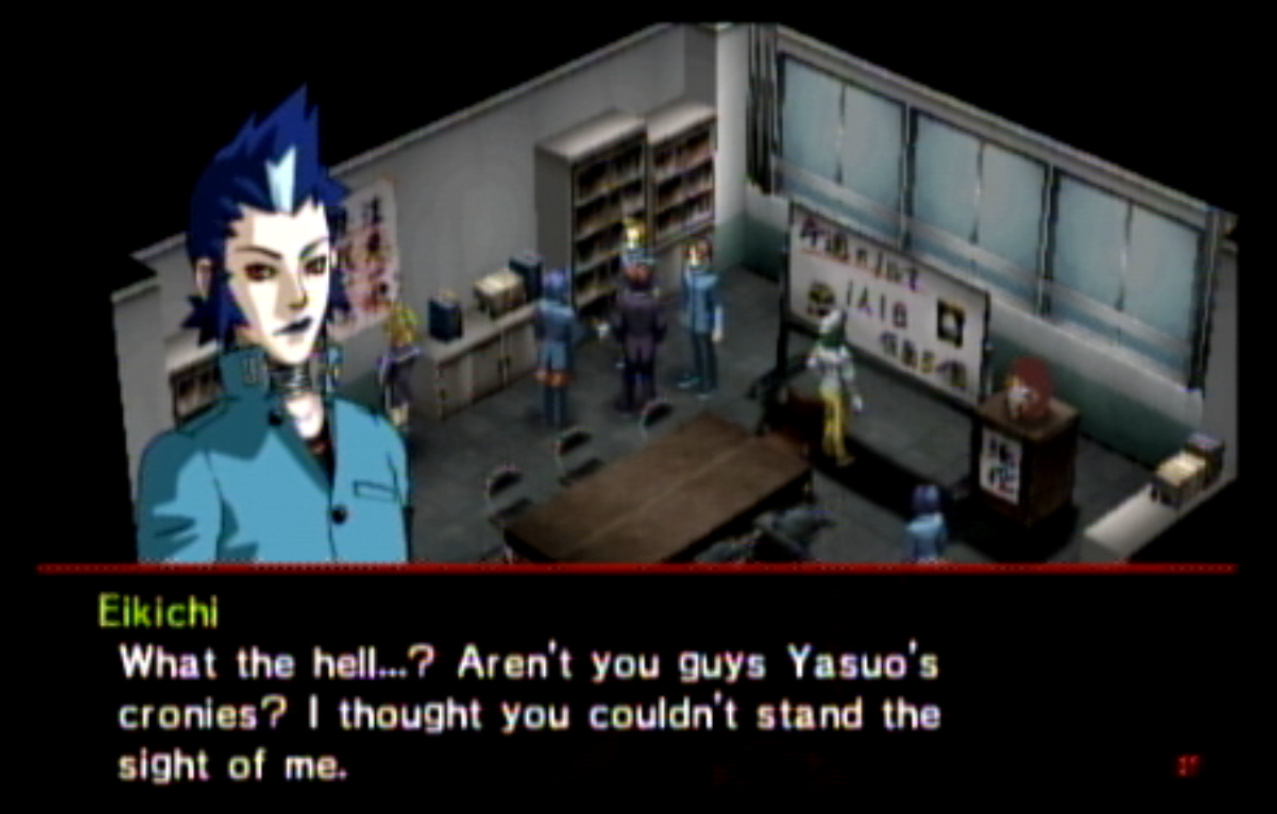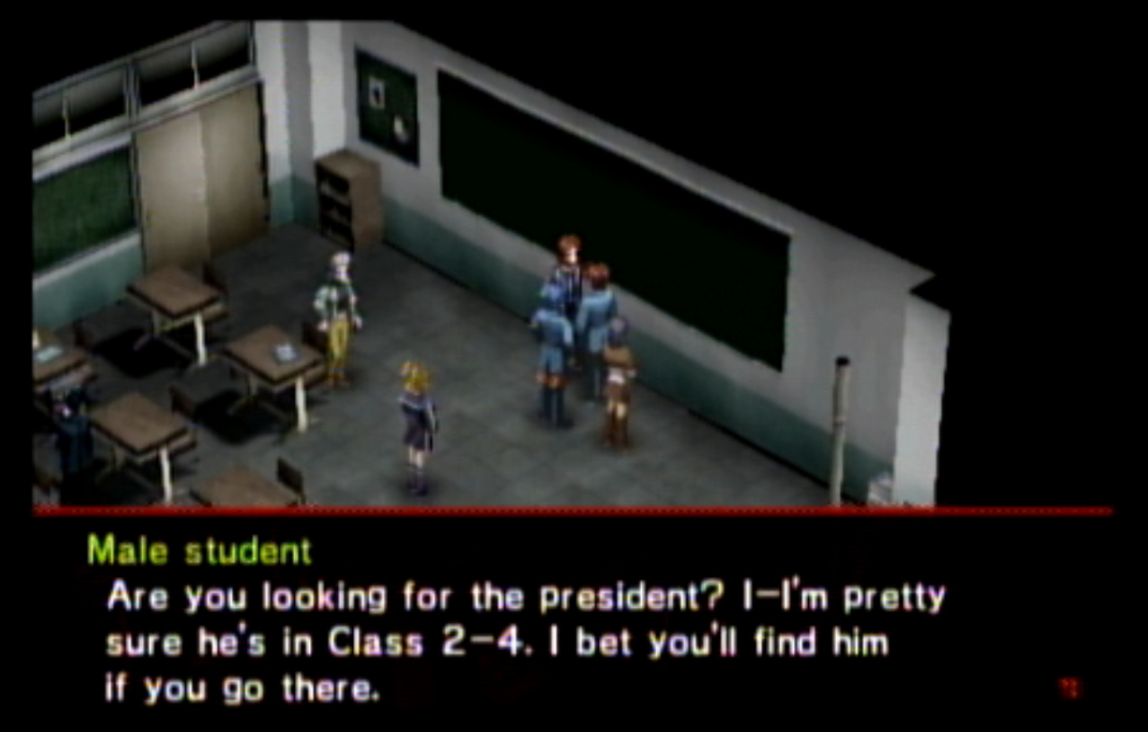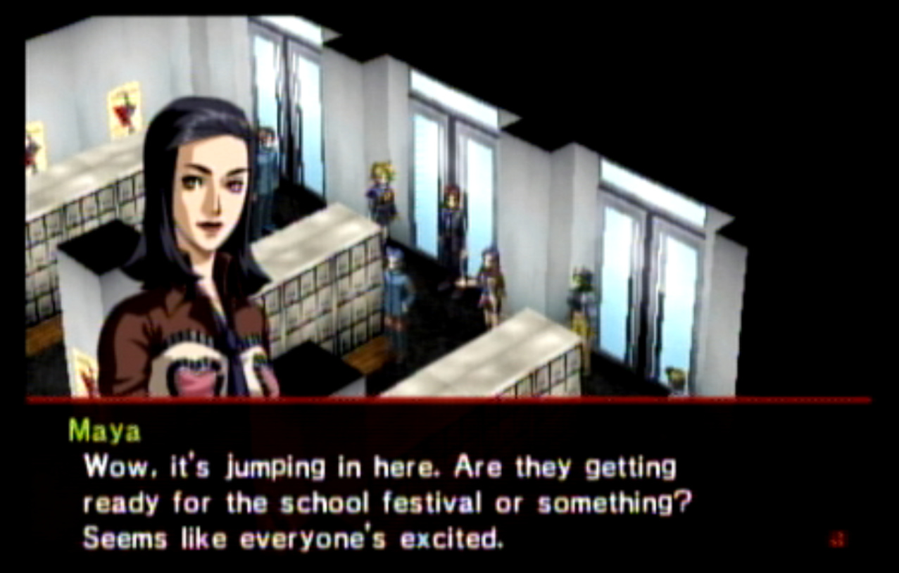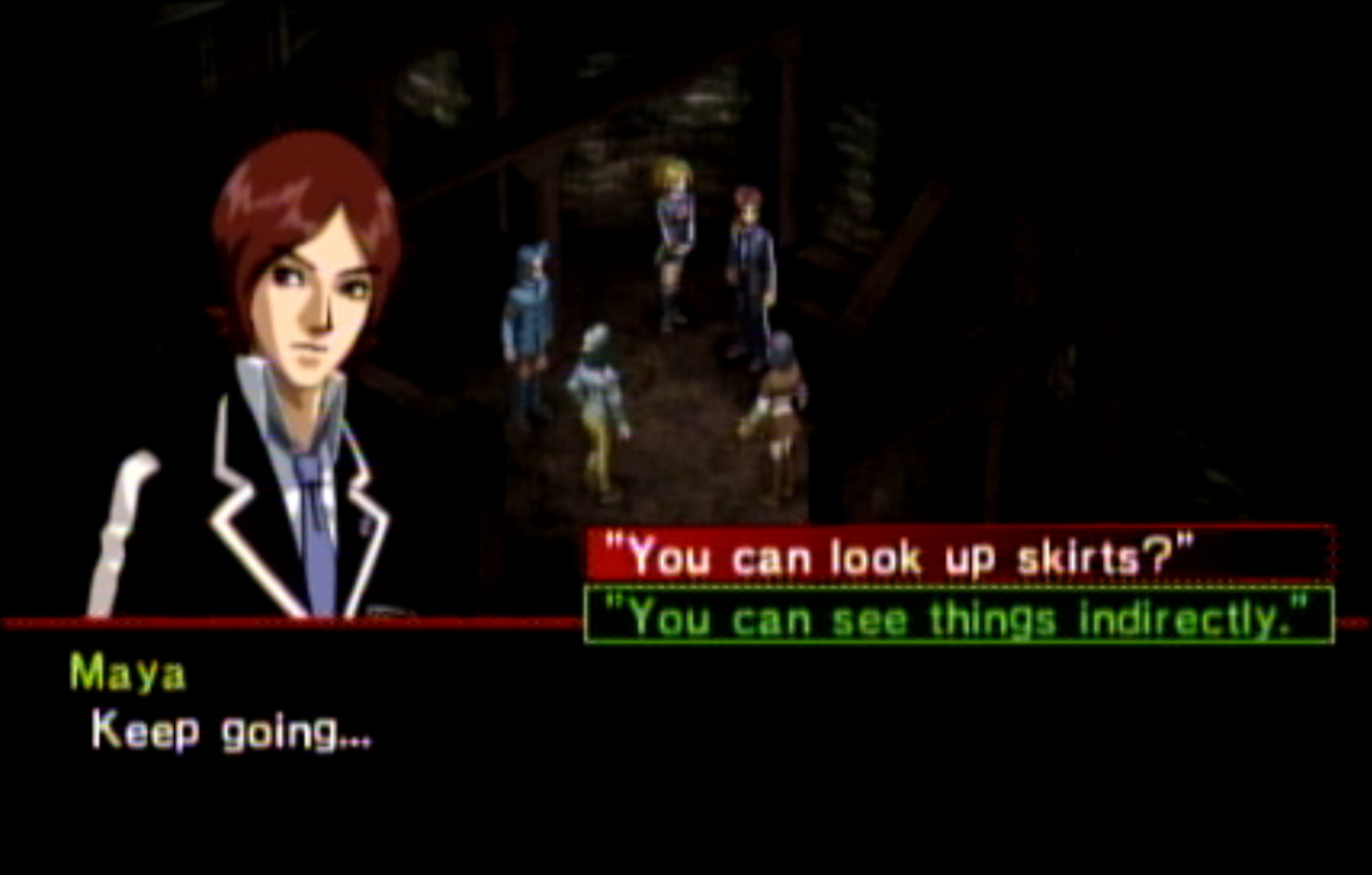: You’ll notice that none of the Personas in Persona 2 use the old art from the SNES games or Devil Summoner. I have no idea why Atlus did this and then re-used the shit out of Nocturne’s models in Persona 3 and 4. : We can only hold a total of 10 personas, and that counts the five we have equipped. The guide for this game says you want to equip Pixie to Tatsuya. That’s wrong. You want to equip it to Maya, because her Persona SUCKS. : Most of the rooms are exactly the same: you go into the room, smash the clock, and either a party member or an NPC will confirm you’ve smashed the clock. 1-D is a bit different though: I think because the developers assumed you would do the rooms starting from the principal’s office on the third floor and working your way down. : This line is super awkward.