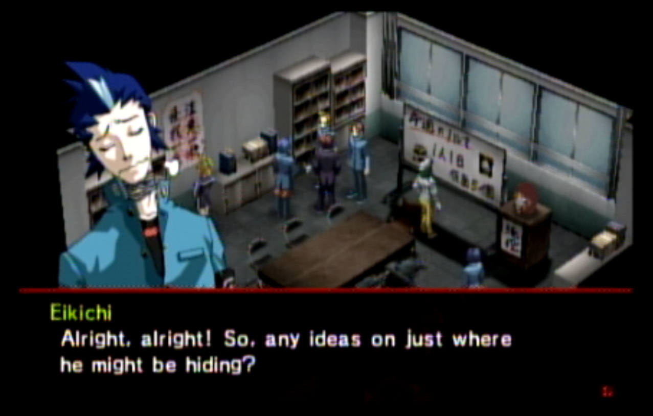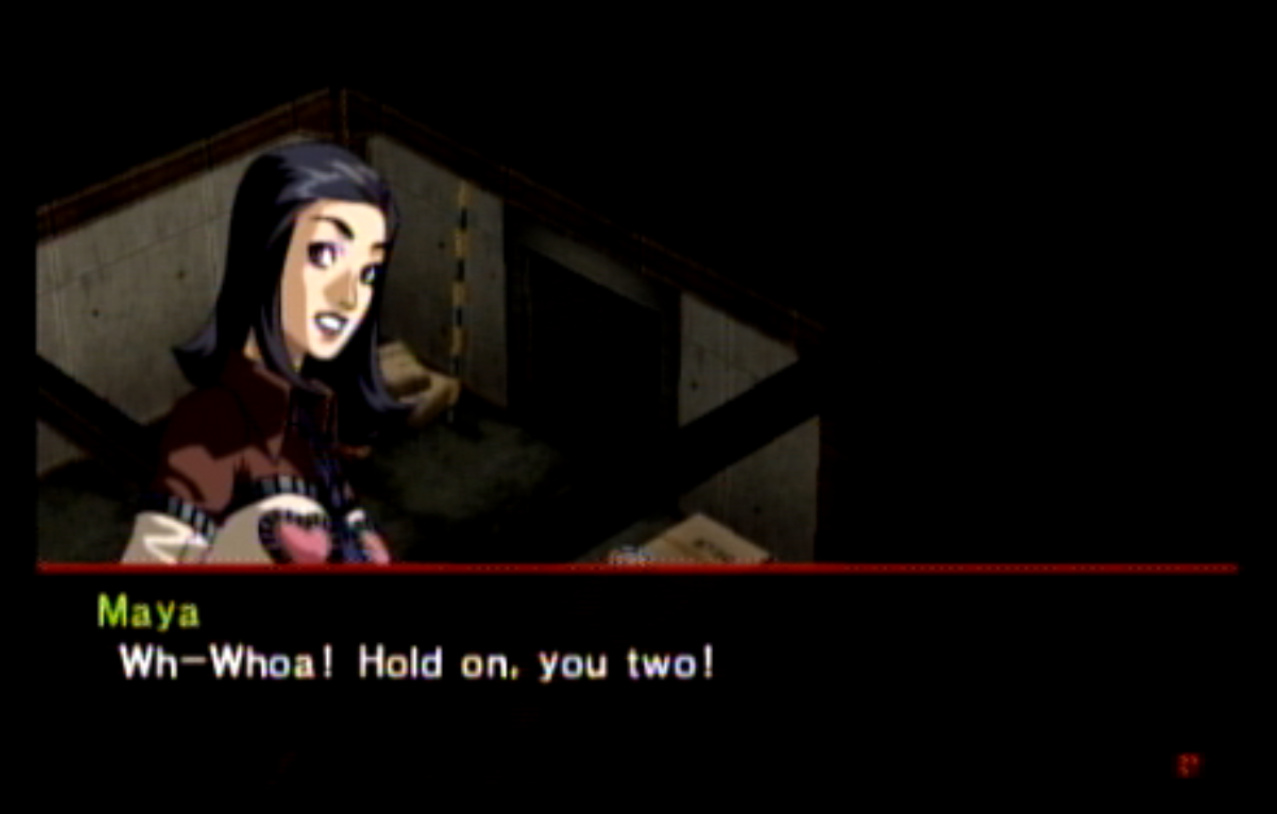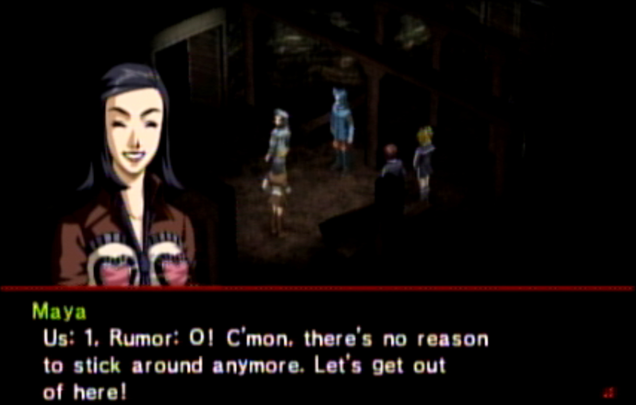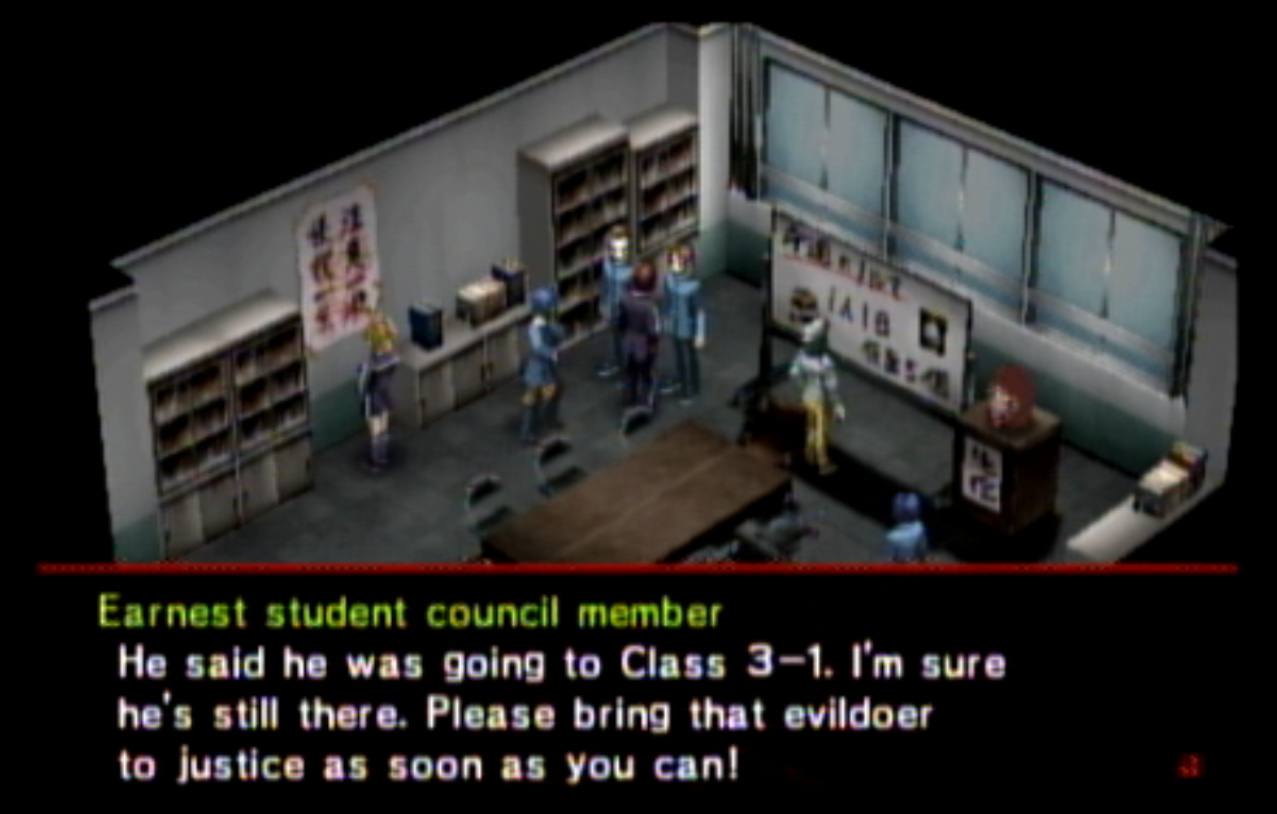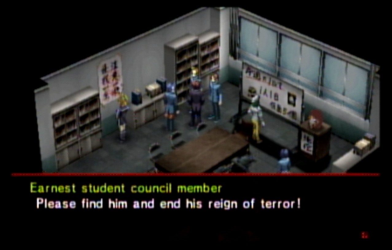 : You’ll notice that none of the Personas in Persona 2 use the old art from the SNES games or Devil Summoner. I have no idea why Atlus did this and then re-used the shit out of Nocturne’s models in Persona 3 and 4. : We can only hold a total of 10 personas, and that counts the five we have equipped. The guide for this game says you want to equip Pixie to Tatsuya. That’s wrong. You want to equip it to Maya, because her Persona SUCKS. : Most of the rooms are exactly the same: you go into the room, smash the clock, and either a party member or an NPC will confirm you’ve smashed the clock. 1-D is a bit different though: I think because the developers assumed you would do the rooms starting from the principal’s office on the third floor and working your way down. : This line is super awkward.