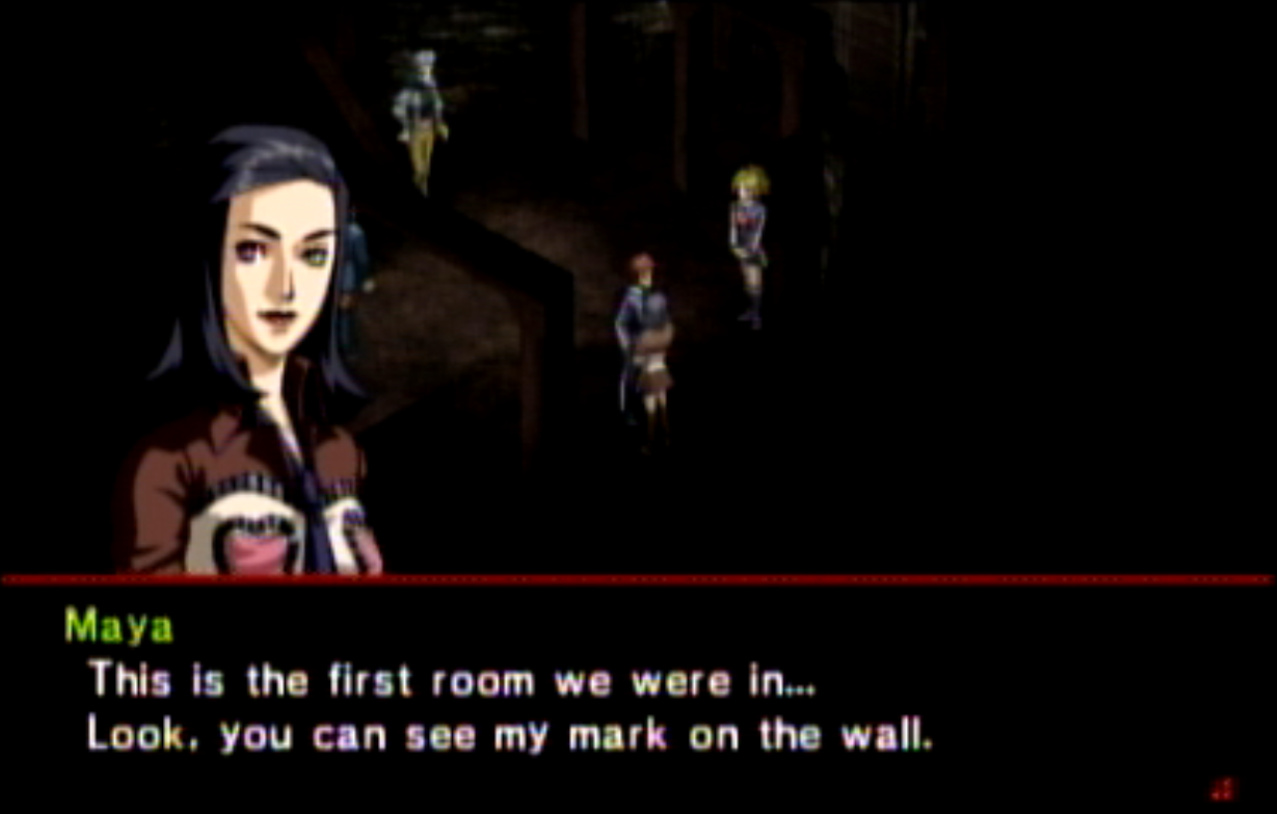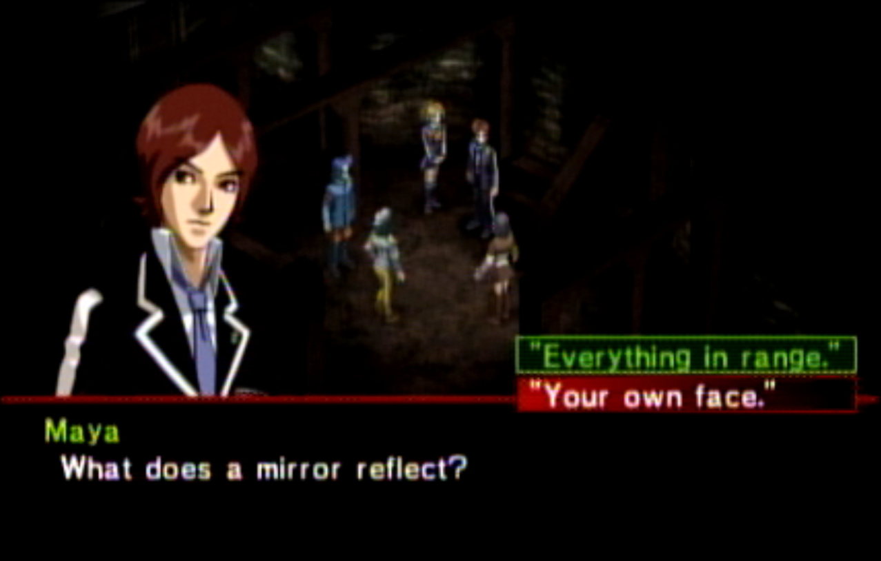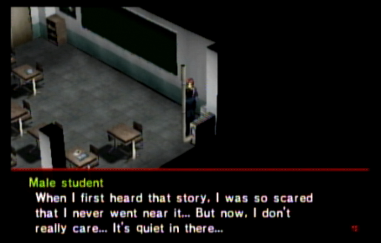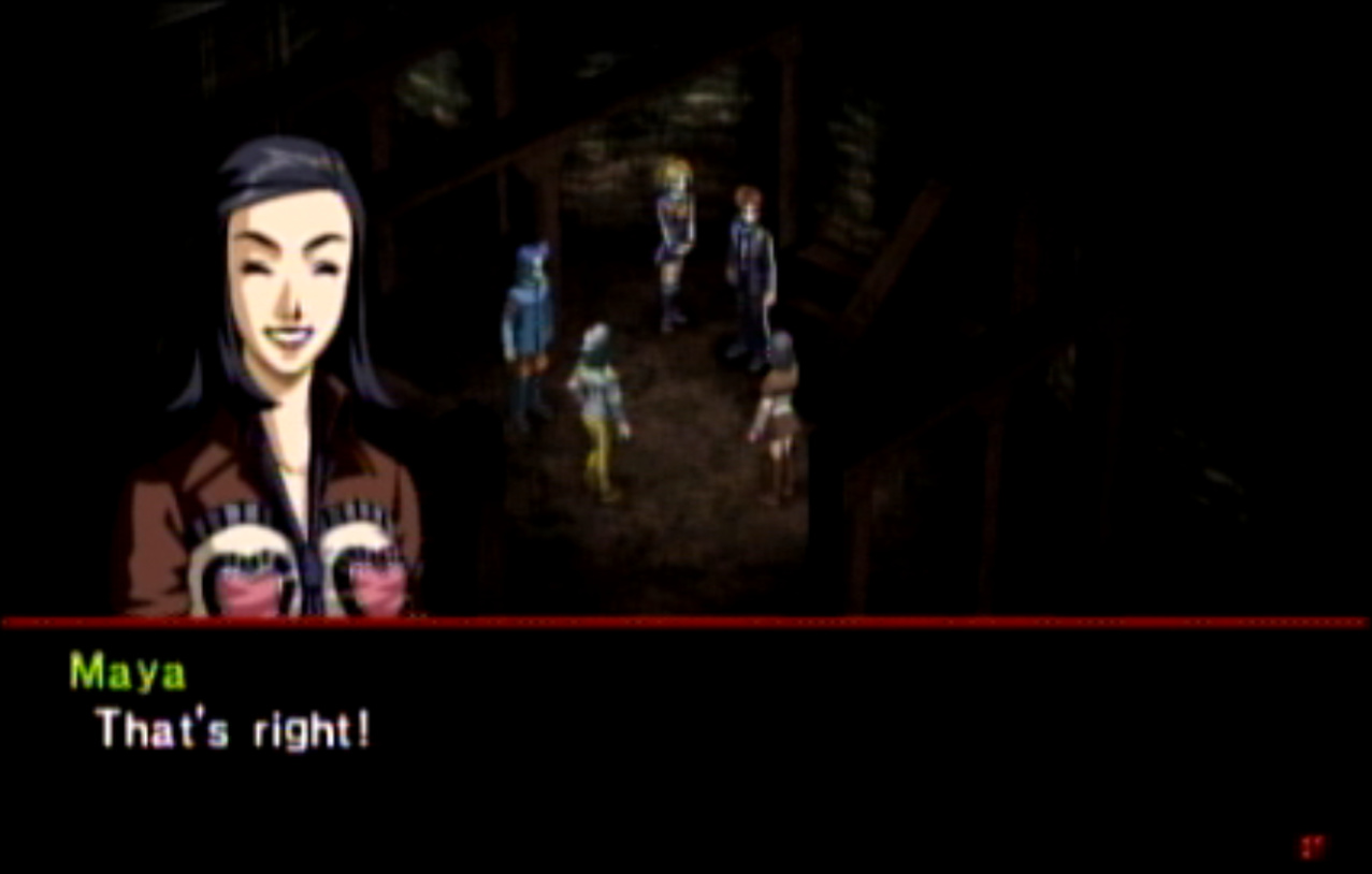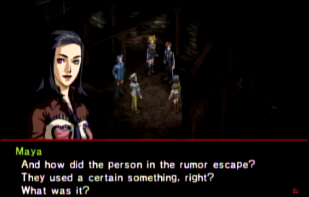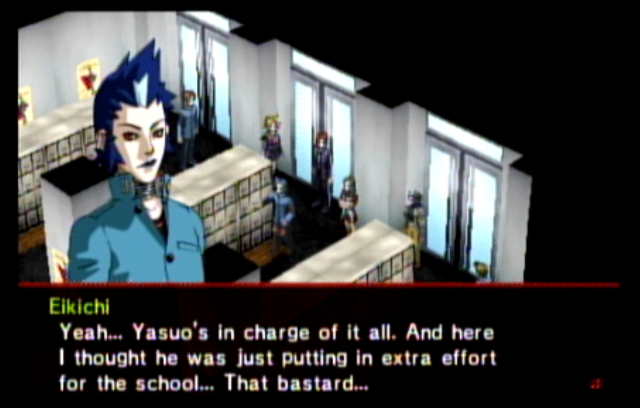: You’ll notice that none of the Personas in Persona 2 use the old art from the SNES games or Devil Summoner. I have no idea why Atlus did this and then re-used the shit out of Nocturne’s models in Persona 3 and 4. : We can only hold a total of 10 personas, and that counts the five we have equipped. The guide for this game says you want to equip Pixie to Tatsuya. That’s wrong. You want to equip it to Maya, because her Persona SUCKS. : Most of the rooms are exactly the same: you go into the room, smash the clock, and either a party member or an NPC will confirm you’ve smashed the clock. 1-D is a bit different though: I think because the developers assumed you would do the rooms starting from the principal’s office on the third floor and working your way down. : This line is super awkward.
