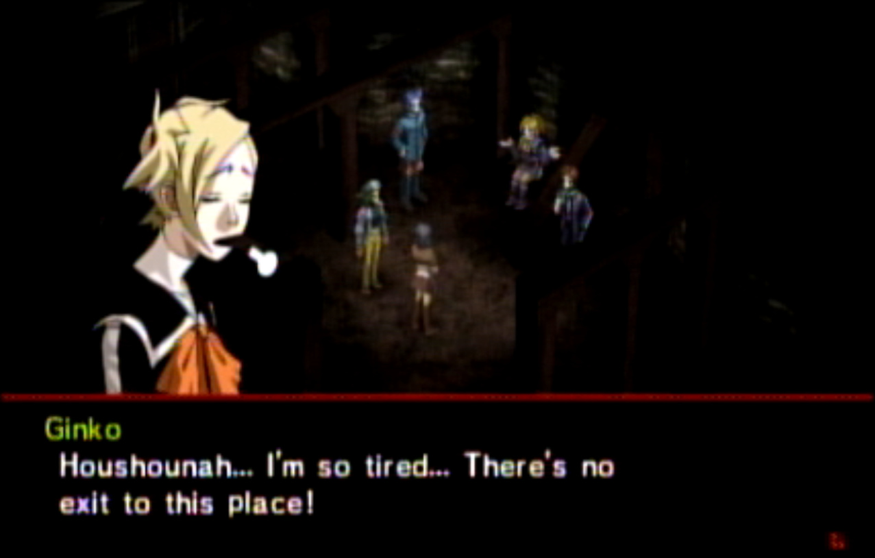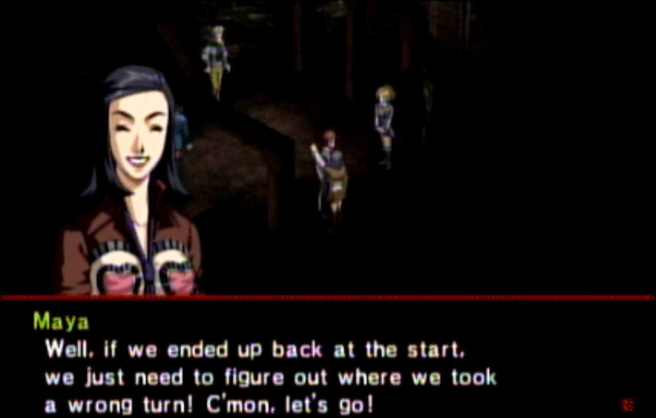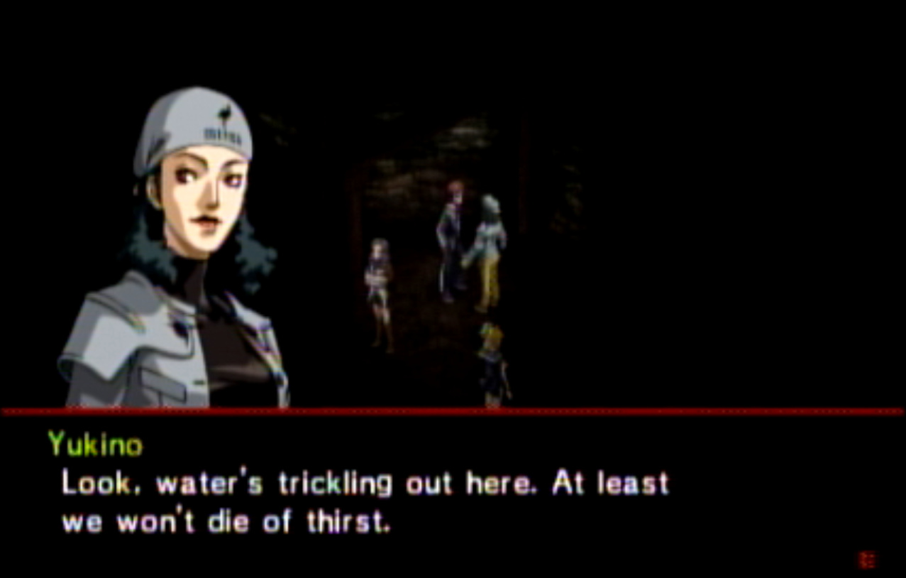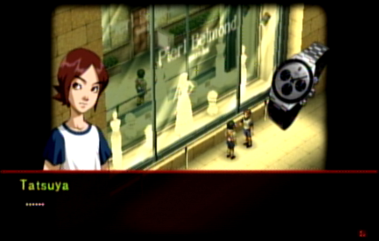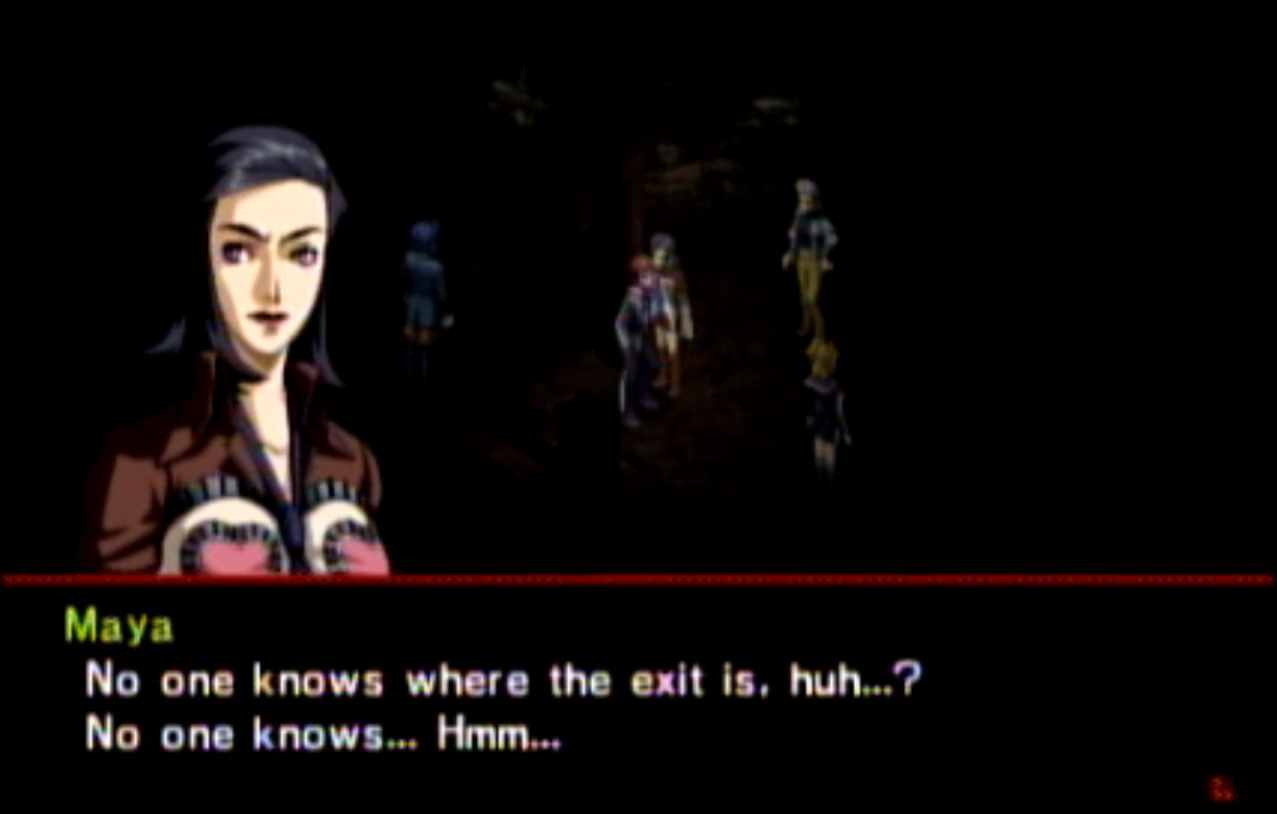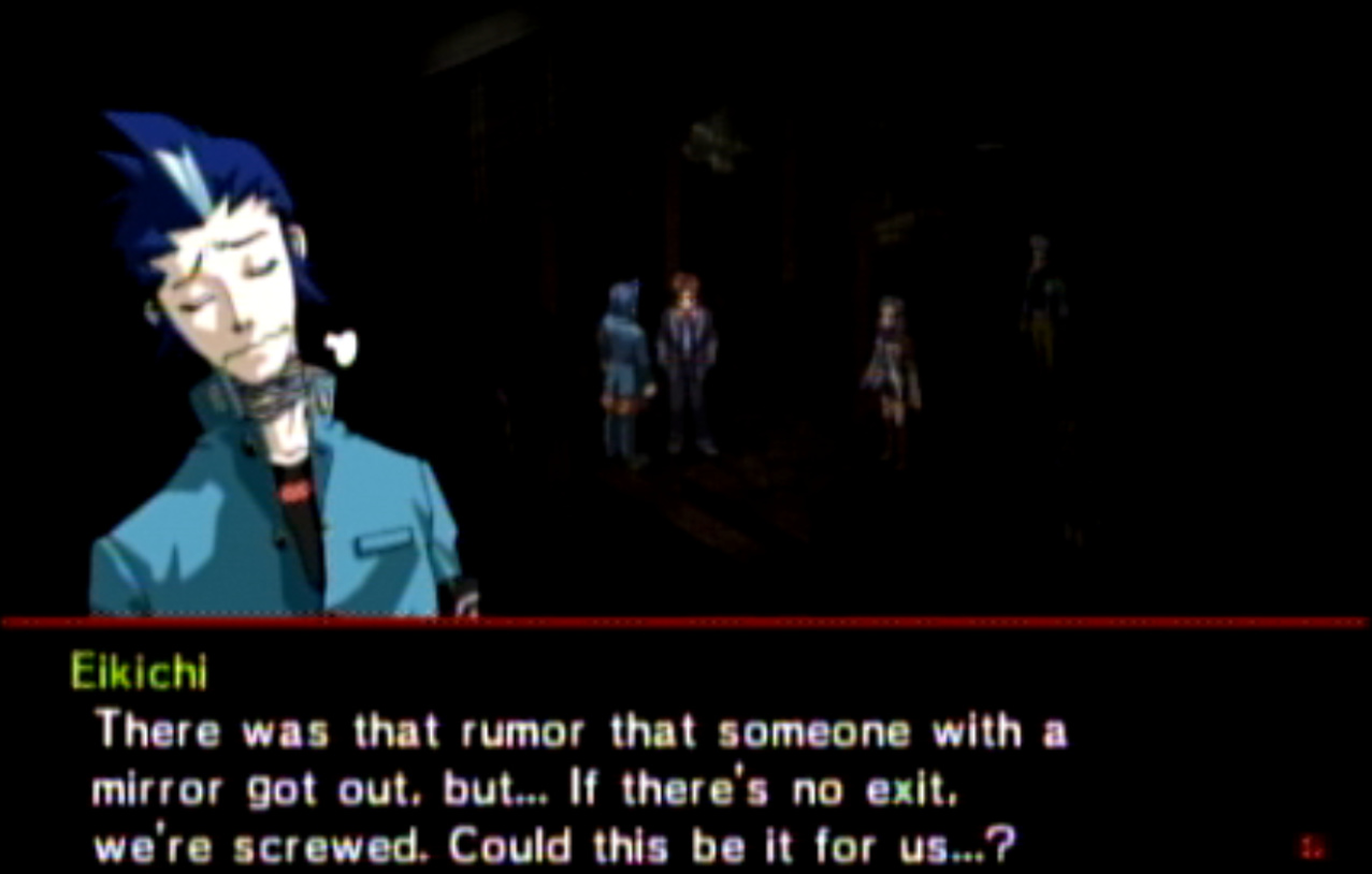 : You’ll notice that none of the Personas in Persona 2 use the old art from the SNES games or Devil Summoner. I have no idea why Atlus did this and then re-used the shit out of Nocturne’s models in Persona 3 and 4. : We can only hold a total of 10 personas, and that counts the five we have equipped. The guide for this game says you want to equip Pixie to Tatsuya. That’s wrong. You want to equip it to Maya, because her Persona SUCKS. : Most of the rooms are exactly the same: you go into the room, smash the clock, and either a party member or an NPC will confirm you’ve smashed the clock. 1-D is a bit different though: I think because the developers assumed you would do the rooms starting from the principal’s office on the third floor and working your way down. : This line is super awkward.
