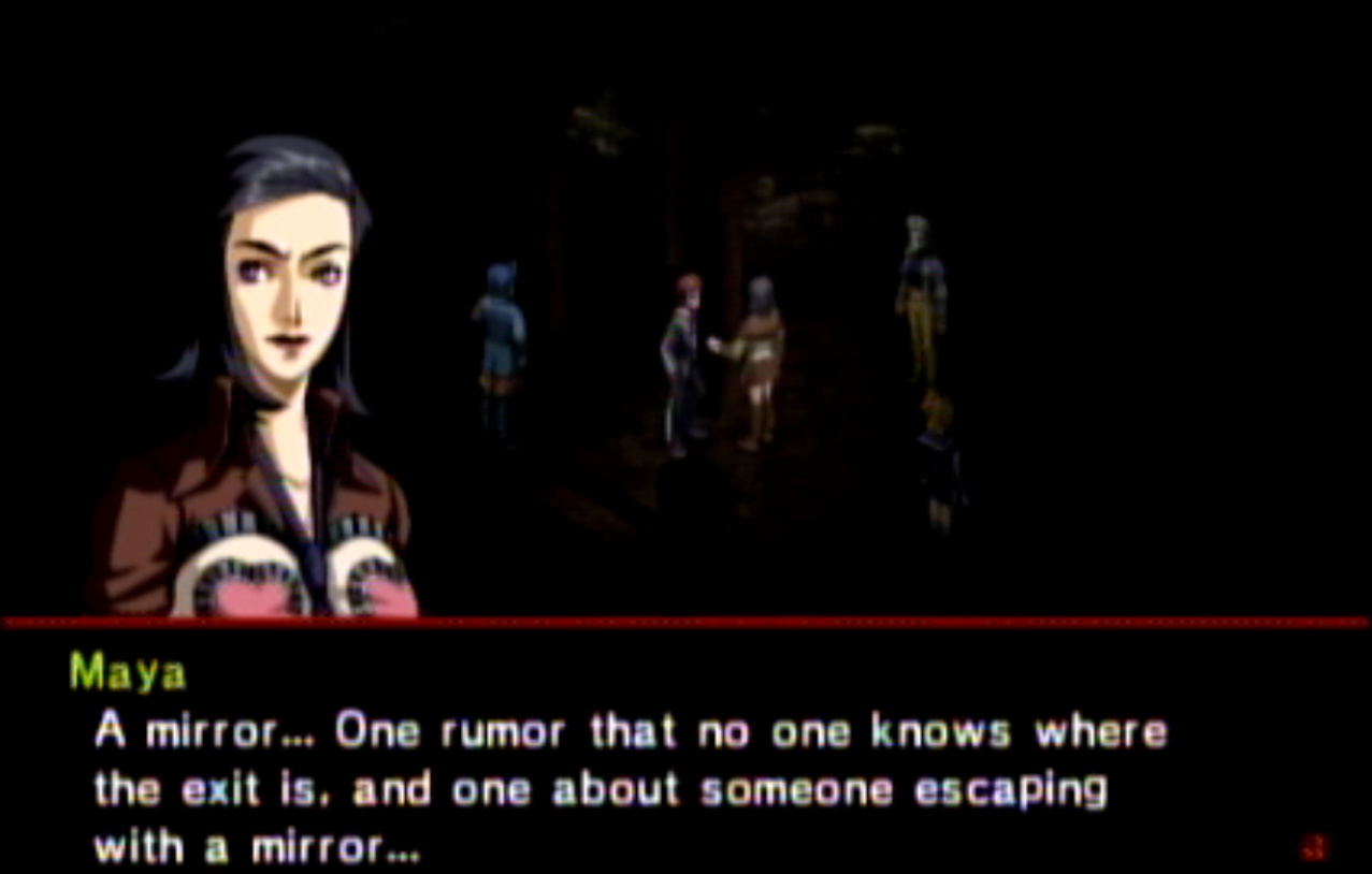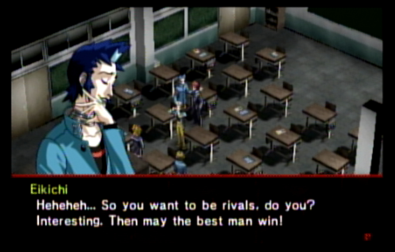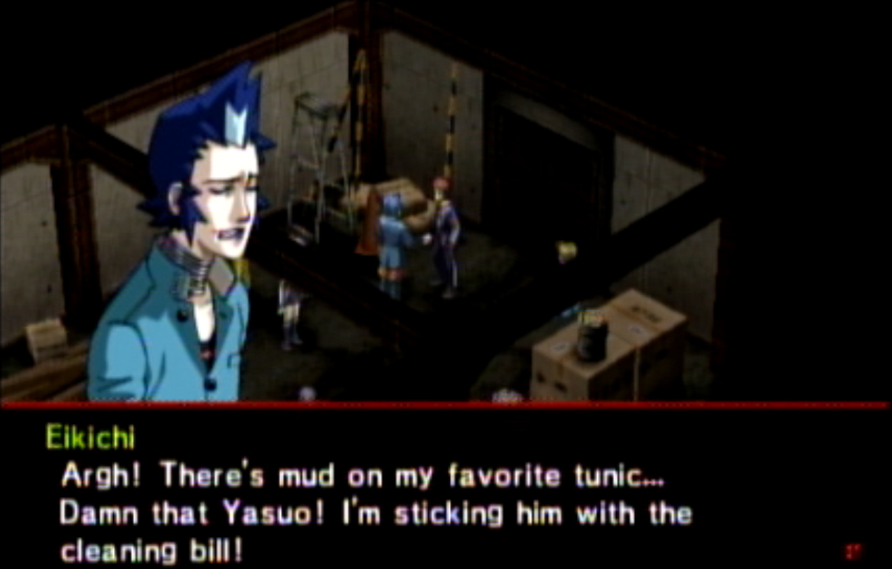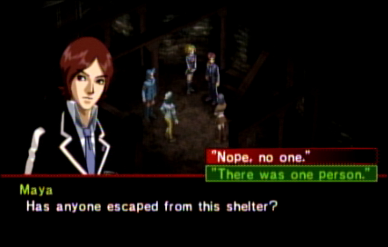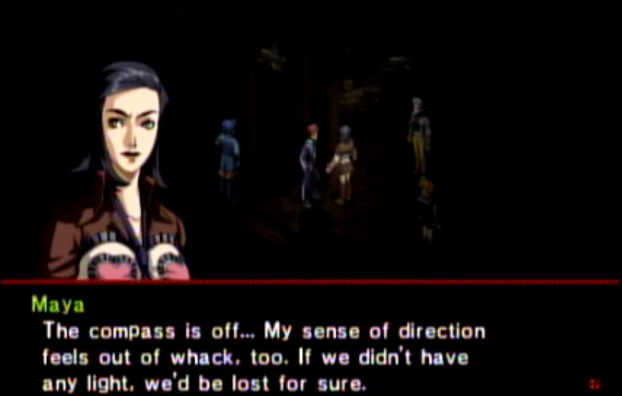 : You’ll notice that none of the Personas in Persona 2 use the old art from the SNES games or Devil Summoner. I have no idea why Atlus did this and then re-used the shit out of Nocturne’s models in Persona 3 and 4. : We can only hold a total of 10 personas, and that counts the five we have equipped. The guide for this game says you want to equip Pixie to Tatsuya. That’s wrong. You want to equip it to Maya, because her Persona SUCKS. : Most of the rooms are exactly the same: you go into the room, smash the clock, and either a party member or an NPC will confirm you’ve smashed the clock. 1-D is a bit different though: I think because the developers assumed you would do the rooms starting from the principal’s office on the third floor and working your way down. : This line is super awkward.