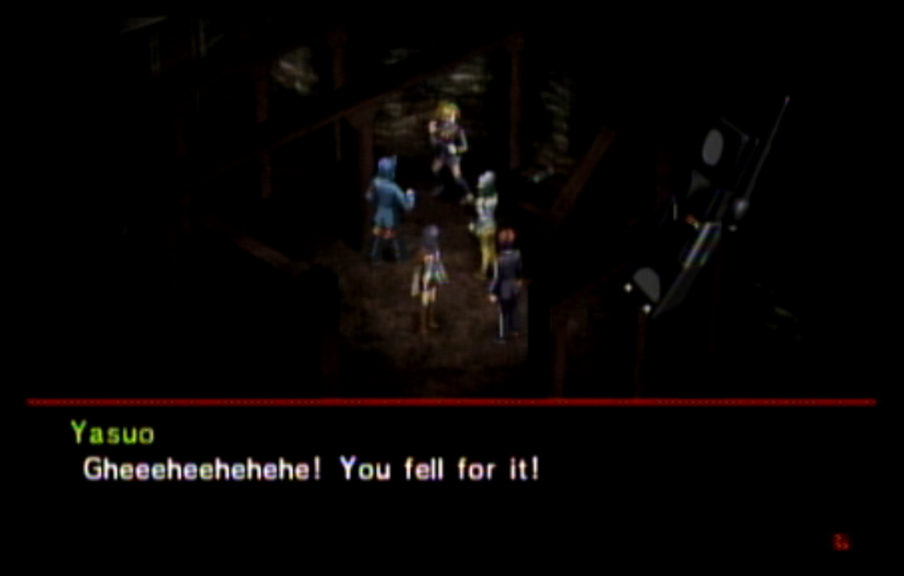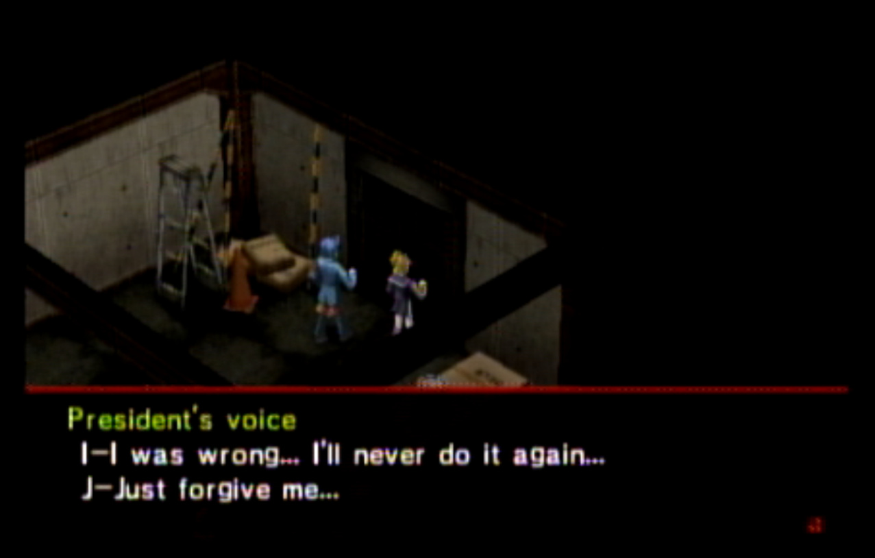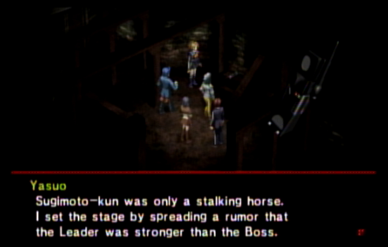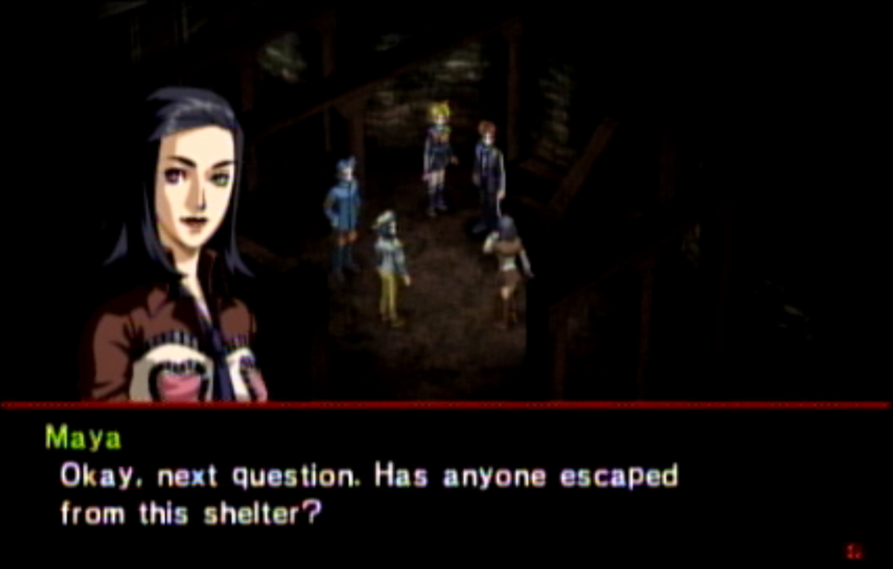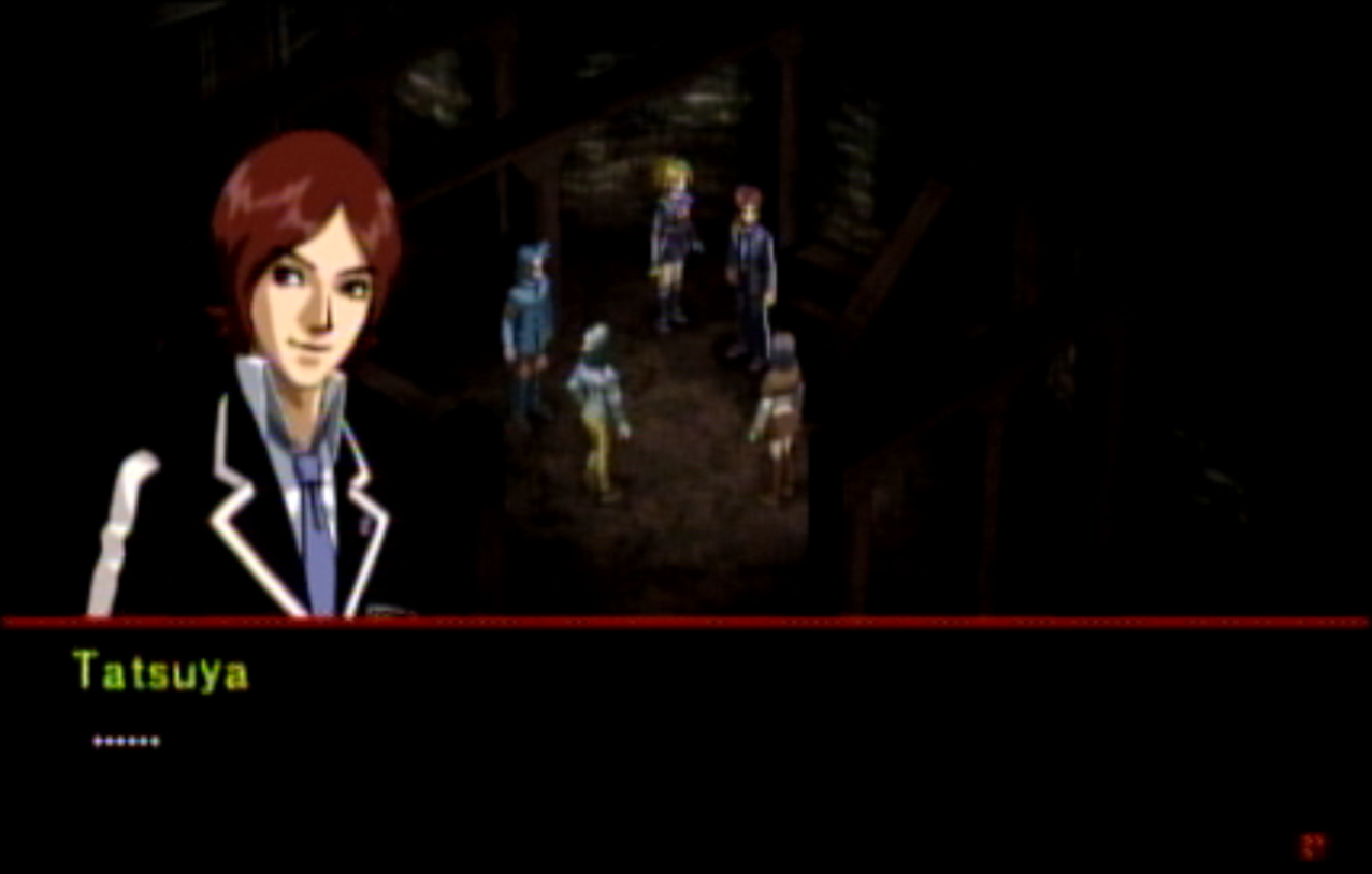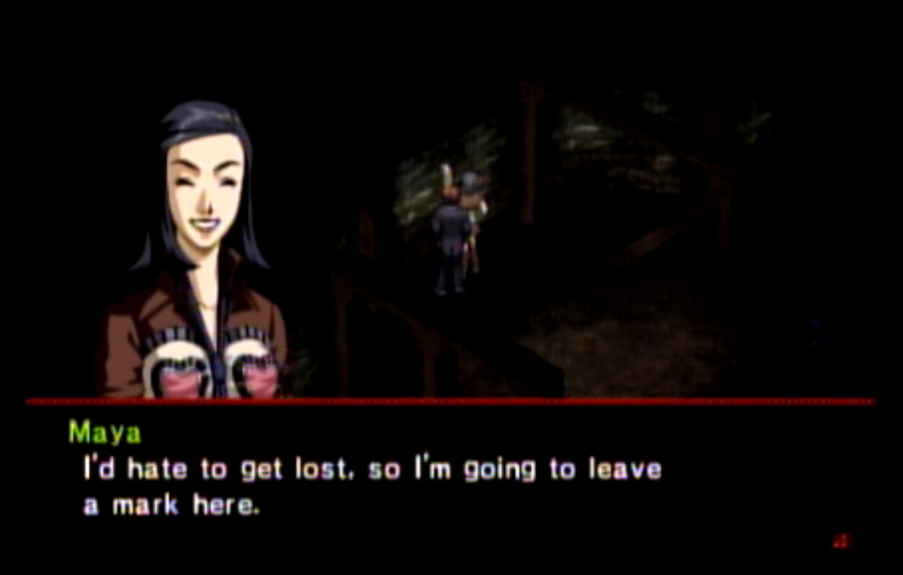 : You’ll notice that none of the Personas in Persona 2 use the old art from the SNES games or Devil Summoner. I have no idea why Atlus did this and then re-used the shit out of Nocturne’s models in Persona 3 and 4. : We can only hold a total of 10 personas, and that counts the five we have equipped. The guide for this game says you want to equip Pixie to Tatsuya. That’s wrong. You want to equip it to Maya, because her Persona SUCKS. : Most of the rooms are exactly the same: you go into the room, smash the clock, and either a party member or an NPC will confirm you’ve smashed the clock. 1-D is a bit different though: I think because the developers assumed you would do the rooms starting from the principal’s office on the third floor and working your way down. : This line is super awkward.