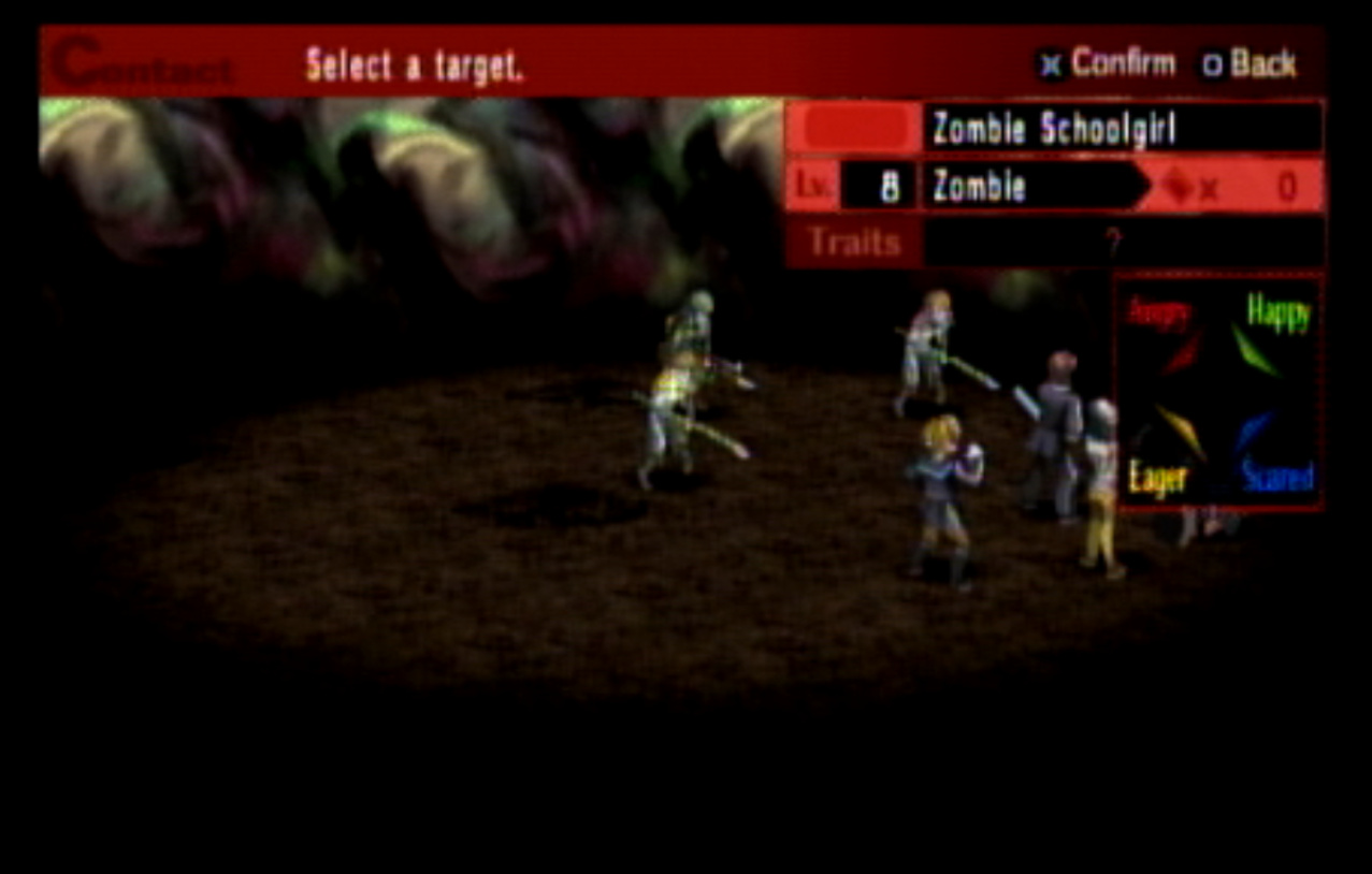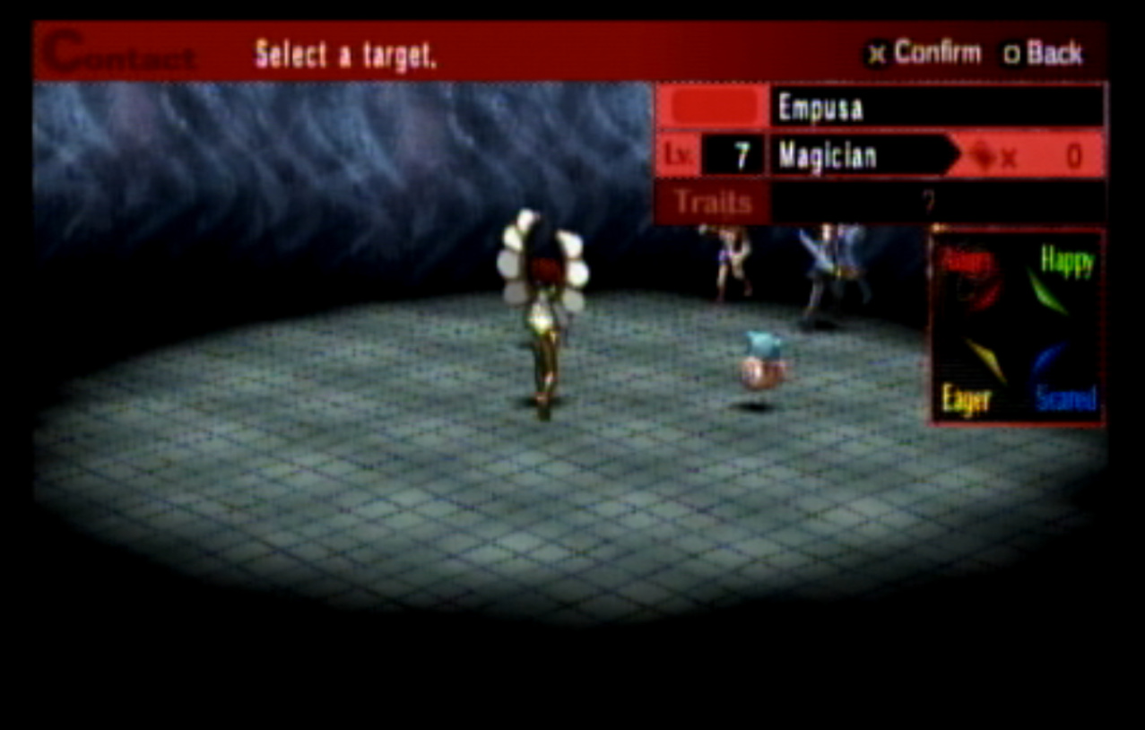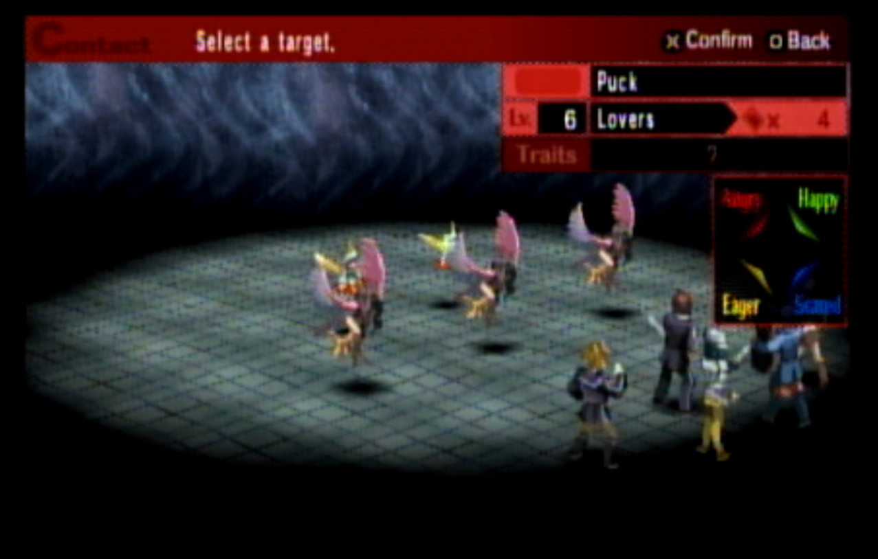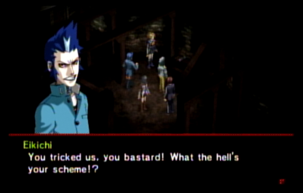 : Welcome to Update 4, in which I realize that Persona 2 is not exactly the best Persona game. : Right outside the Principal’s Office, I run into Ratatoskr, who is a legendary squirrel from Norse mythology who runs up and down Yggdrasil delivering messages. In this game, Ratatotskr is a furry. : There’s also Pixie, which we need to encounter a few times if we want some decent spells later. : The problem with the negotiation system is this. Persona 2 is an extremely slow game - and I don’t mean the pacing. There’s long load screens before and after every battle, and the menus move very slowly compared to Persona 1’s. Negotiations in particular suck because every time you want to negotiate, you have to go through this menu, select a person, then hit “confirm” at the bottom. : You can use two or three characters at once to negotiate, as seen here. : This is another problem. The negotiation techniques all have lengthy animations (and sometimes multiple text boxes) associated with them. The animations are also very slow. : Just like in Persona 1, there’s a free heal spot in the first dungeon which can be abused to grind. Unfortunately, the enemies here give fuck all for EXP. : Shortly thereafter, we have our first Persona Mutation. : There are four kinds of mutations, and all of them are things you want. They are:-