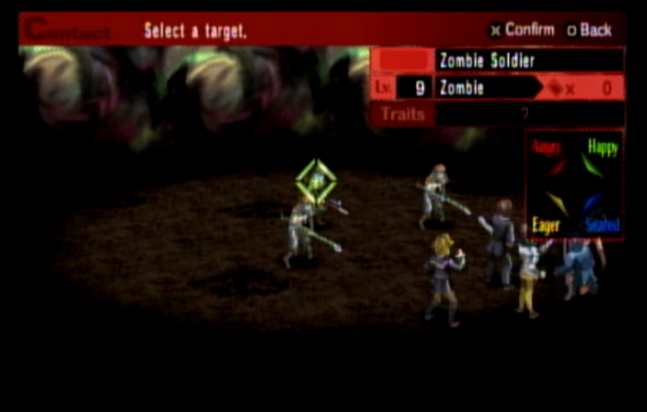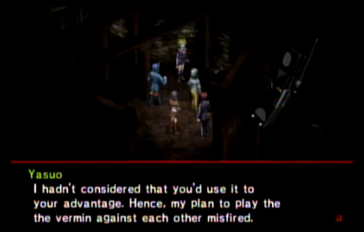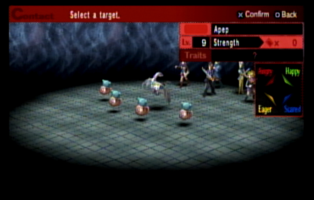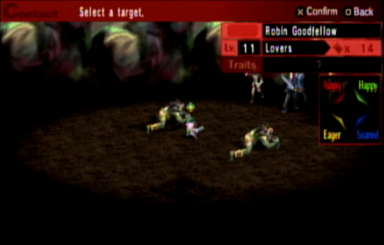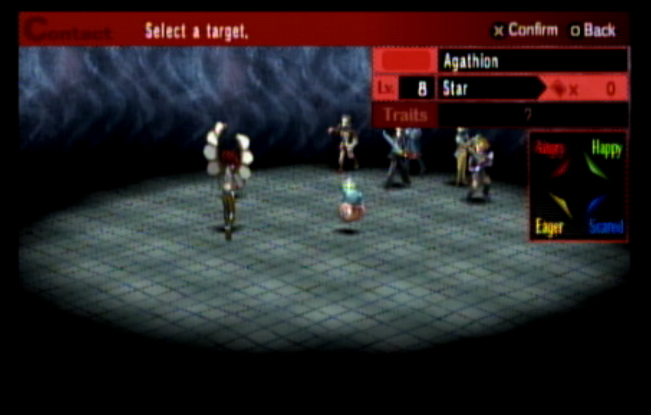 : Welcome to Update 4, in which I realize that Persona 2 is not exactly the best Persona game. : Right outside the Principal’s Office, I run into Ratatoskr, who is a legendary squirrel from Norse mythology who runs up and down Yggdrasil delivering messages. In this game, Ratatotskr is a furry. : There’s also Pixie, which we need to encounter a few times if we want some decent spells later. : The problem with the negotiation system is this. Persona 2 is an extremely slow game - and I don’t mean the pacing. There’s long load screens before and after every battle, and the menus move very slowly compared to Persona 1’s. Negotiations in particular suck because every time you want to negotiate, you have to go through this menu, select a person, then hit “confirm” at the bottom. : You can use two or three characters at once to negotiate, as seen here. : This is another problem. The negotiation techniques all have lengthy animations (and sometimes multiple text boxes) associated with them. The animations are also very slow. : Just like in Persona 1, there’s a free heal spot in the first dungeon which can be abused to grind. Unfortunately, the enemies here give fuck all for EXP. : Shortly thereafter, we have our first Persona Mutation. : There are four kinds of mutations, and all of them are things you want. They are:-