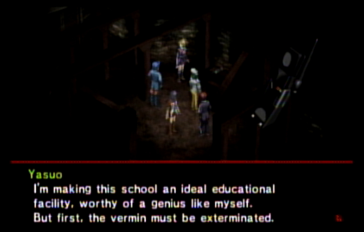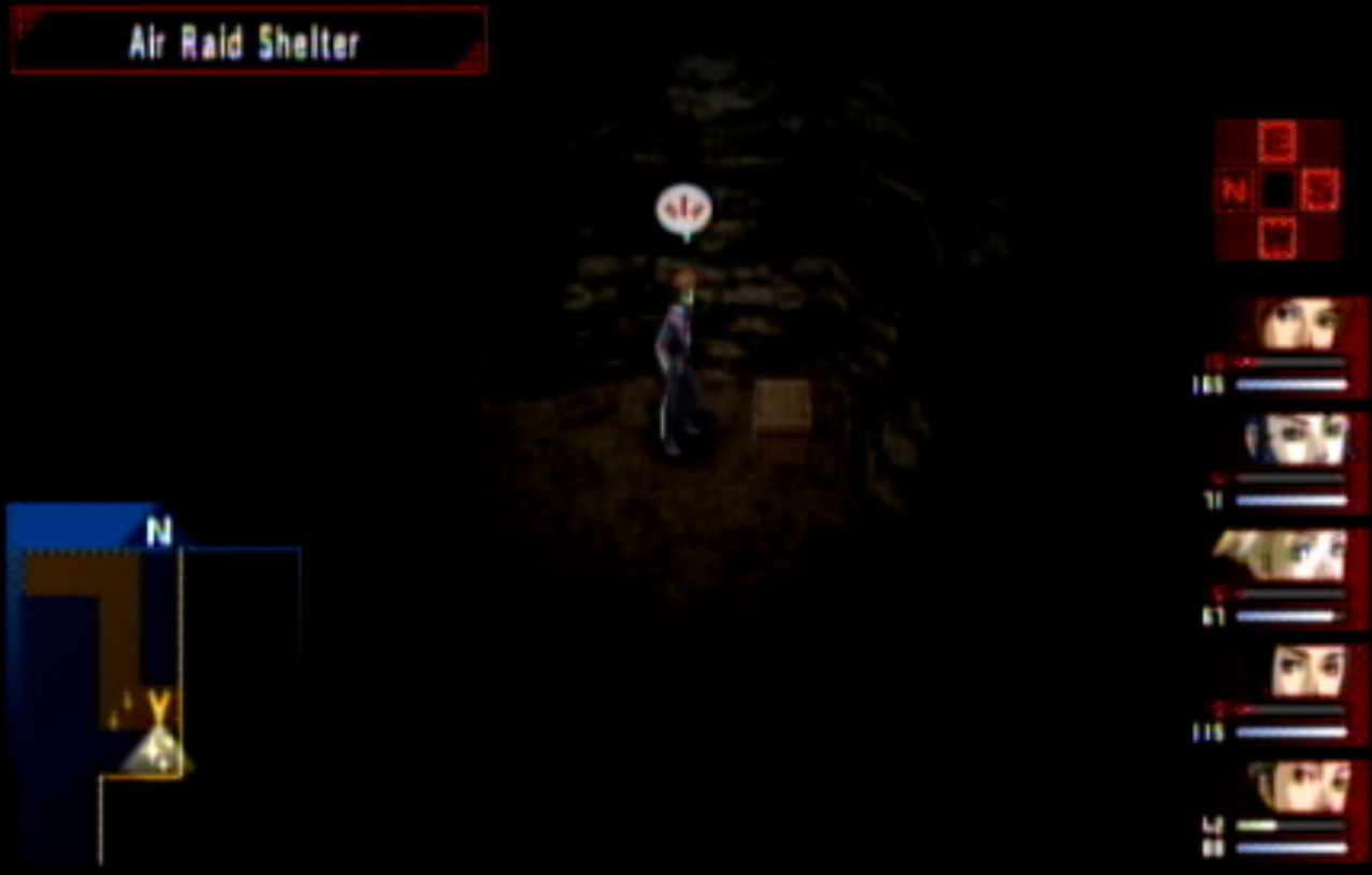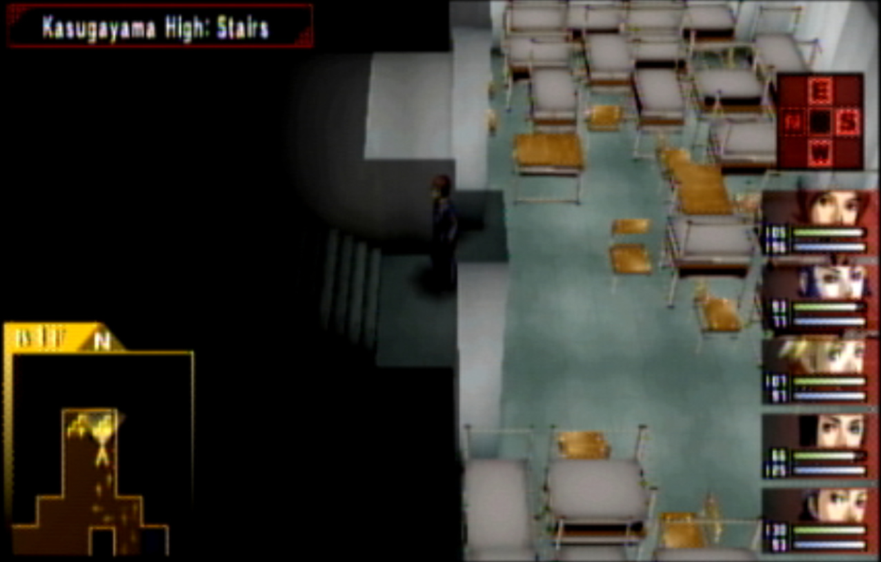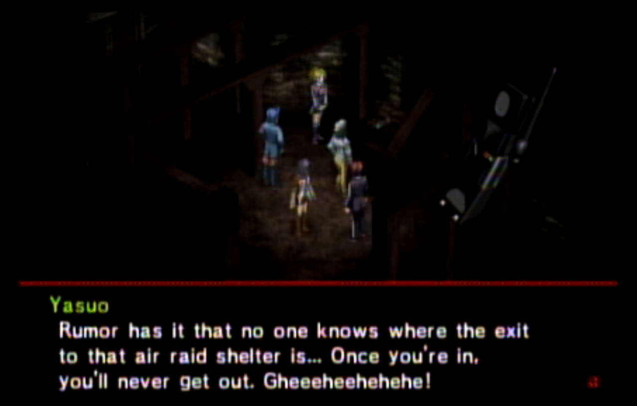 : We’re on our way to Kasugayama High, also known as Cuss High. : Cuss High is largely the same inside as Seven Sisters, with one exception that we’ll see a bit later. : Right away, we encounter two new enemies: Empusa and Agathion. The guide says that you should be making pacts with the demons around here, and it was here I finally found out what pacts do. : Unfortunately, the developers caught onto the whole “party member catchup” thing from Persona 1 and got rid of it. Eikichi is only level 6, which makes us basically unable to make a pact with anything. : So anyway, here’s what making a pact does, apart from being a bad game mechanic. When you make a pact with a demon, it doubles the number of tarot cards the demon gives on a successful negotiation. It also causes the demon to give you Free Cards. Why is this important? : The answer is that there are certain arcanas that demons do not drop cards for. To get Personas of those arcanas (Emperor is one) you need to use Free Cards. The sole exception are Fool Personas, which were a pain to get in P1 and are even more of a pain to get in P2. : Apep here is one demon the guide recommends making a pact with for Strength cards. Unfortunately, we need Eikichi to do that. : Even though Eikichi has told us where to go, we don’t want to go there just yet. Most of the rooms in Cuss High are blocked off, but 1-2 isn’t. : This gets Tatsuya another pair negotiation technique with Eikichi. I think the cutoff point for this is actually a bit after where we are. : This student gives us a hint about where we’re going next. It seems Cuss High has a bomb shelter built underneath it. I looked it up, and this actually wasn’t unheard of in the US: a bunch of schools had bomb shelters built underneath them in the 1960s, during the height of the Cold War. : Interestingly, a lot of these bomb shelters were built by civilians and to no one’s surprise a lot of them were both poorly planned and probably not all that effective against a nuclear bomb. One article I saw had a piece about a school with a population of 1300 students in the 60s. The municipality wanted to make it a fallout shelter.. that could hold a total of 340 people. How did they plan who’d get in and who wouldn’t? They uh.. didn’t. : Most of these shelters were meant to be decommissioned after the Cold War ended, but in a lot of cases that never happened and they were simply forgotten because there was no centralized recordkeeping system indicating where they all even were. There was even one under a high school in my home state of Connecticut, found in the early 90s. : Japan apparently has the same problem, only theirs are even more of a problem. For one, they’re much older (dating back to World War II) and also tend to come with the problem of unexploded WWII-era bombs. : If you walk by the rooms, you can see that some of them are decorated for the festival. Unfortunately, we can’t go into any of them. : The encounter rate is absurdly high, and we run into Puck. Puck was in Club Zodiac, but I don’t think I ever saw him. The guide recommends making a pact with him to get Lovers cards, and I did but it broke before I could get anything out of it. : You know what I’m not already tired of? Running around a building chasing after someone. Not like we’ve done this twice already. : Now we get to go all the way back to the stairs and climb back up to the third floor. : I’m pretty sure that by the time I got here, I had already put in more time than I did in Thanatos Tower in P1 because of how slow everything is. : 2-4 is just down the stairs from 3-1, so it’s not much of a walk. : Now we get to go all the way to the bomb shelter. I took a break and went to see what I could fuse at the Velvet Room. Unfortunately, everything there was either no good or would break the ability to use Mega Blaze. I could’ve replaced the Pixie we made with a Harpy, but there wasn’t much of a point. : The stairs to the basement are right near the gym on the west side of the school. : It’s kind of strange to me that the school has such a small basement. I know the one in Connecticut was only part of the basement and not the entire thing.