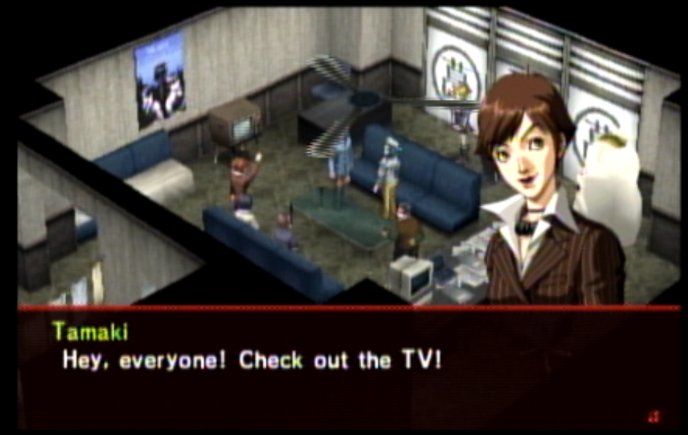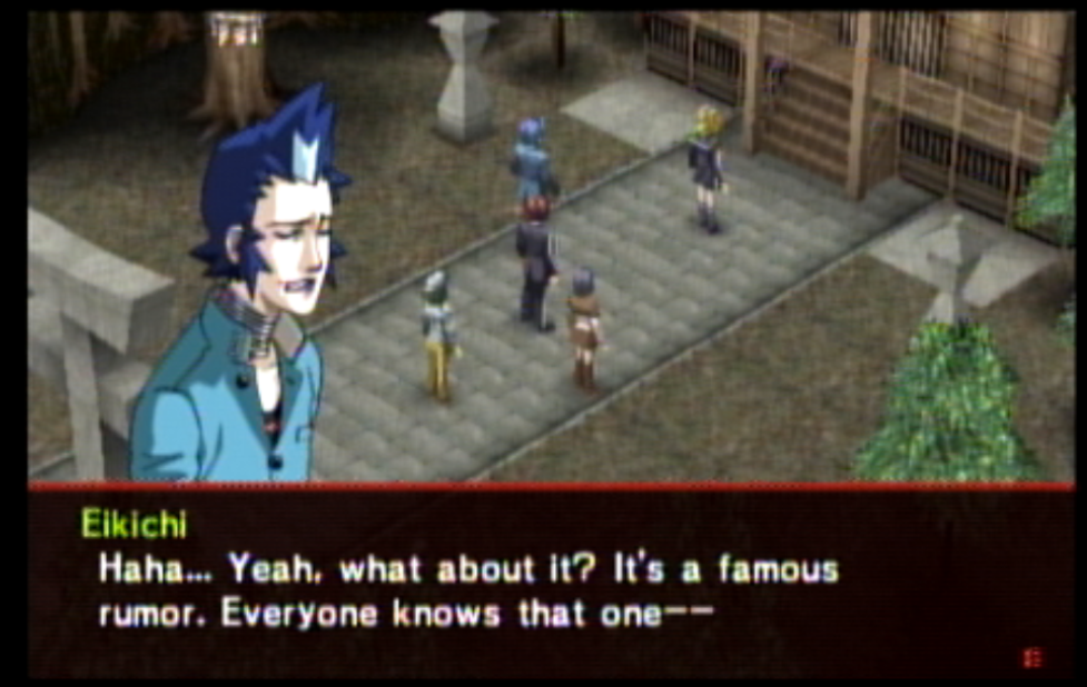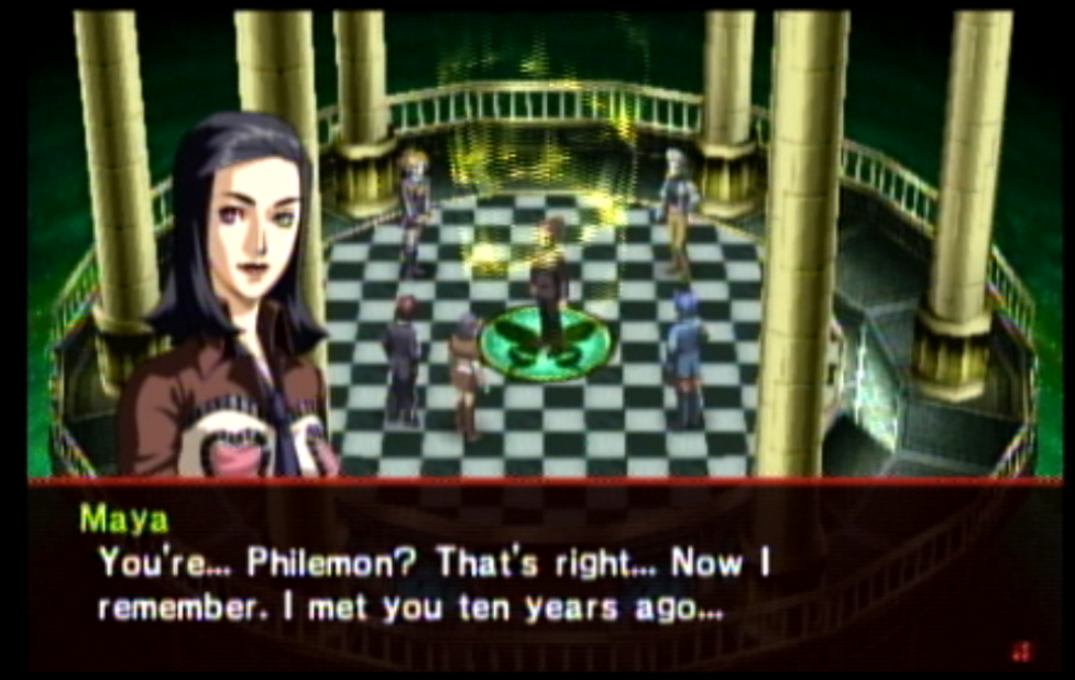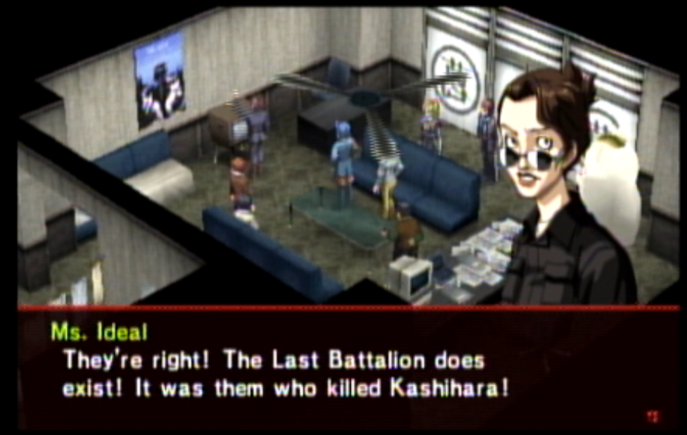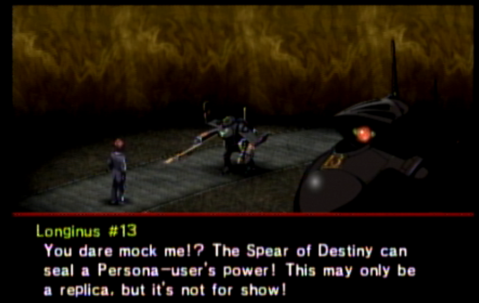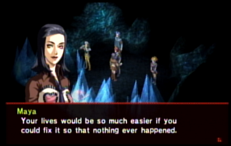 : This is a retcon of Persona 1. In Persona 1, it’s established that the only reason the Persona Game works is because of the DEVA System interfacing with Maki and overwriting reality with her dream world. Theoretically, once the DEVA system blew up at the end of Persona 1, that should’ve been the end of it. Nevermind that this scene is happening in 1989 and the DEVA System wasn’t built until 1996.