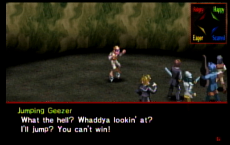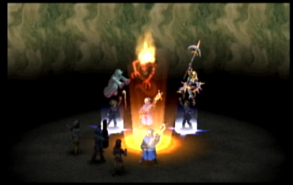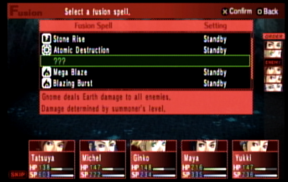 : We have a new possible fusion spell. Four of them, actually. Agrippa has learned a move called Summon Spirits, which combines with any of the basic element spels (fire, earth, water, wind) to make four fusion spells called Sylph, Undine, Gnome, and Salamander. These are okay replacements for things like Mega Blaze and Maxi Tempest that only take two people to perform.
