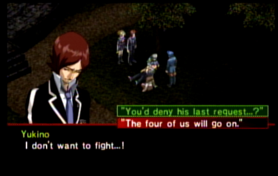 : This is one thing I really don’t like about Innocent Sin. When Persona 1 did this with the ultimate Personas, it would tell you exactly why you got (or didn’t get) them. Here, we have no idea why. In each case, it’s because we made a choice before a boss fight: one in Zodiac, one in Aoba Park and one in the Aerospace Museum. Tatsuya gets his if (and ONLY if) everyone else gets theirs.
