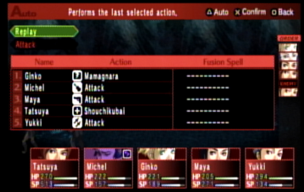 : So how did I handle this fight? Well, like this.. sort of. Everyone but Tatsuya on auto-attack, Tatsuya using Shouchikubai, which heals the entire party for a good chunk of damage and can also remove status effects. I set this up and then went and had lunch.