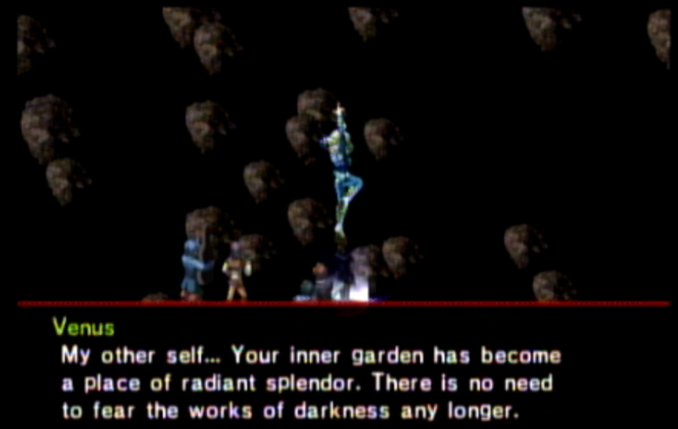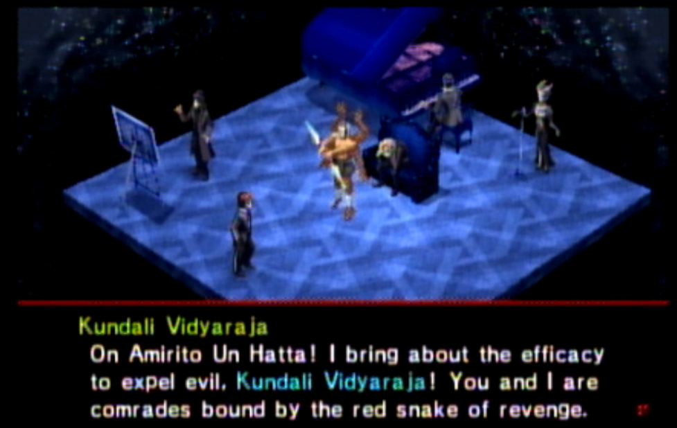 : I made sure to equip Tatsuya with Apollo to get the bonus resistances. What I found out later is that even if you don’t equip the Ultimate Persona for the shadow fights, they’ll still get the boost as long as you have them equipped when the fight ends. There’s even alternate dialog for it, which we’ll see in Scorpio Temple.