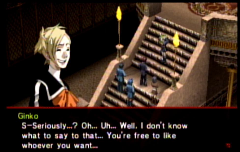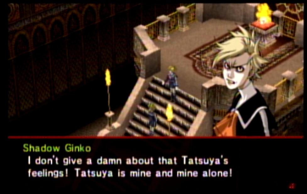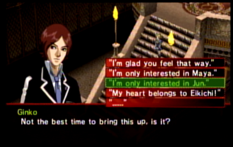 : If you’ll recall, I mentioned there were a couple of things that were believed to be reasons that Atlus didn’t localize Innocent Sin on the PS1. One of those is that a gay relationship, especially one where the playable character is gay, would be “unacceptable” for Western audiences. This is how the 90s were, and also why the 90s sucked.