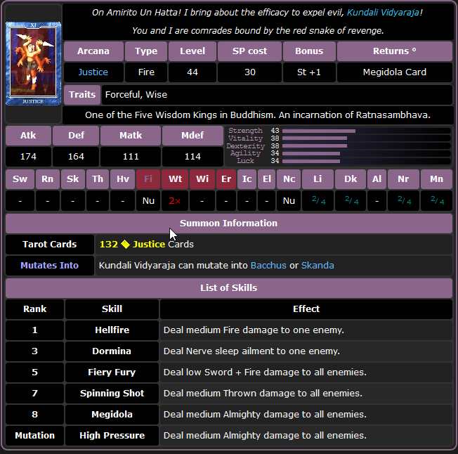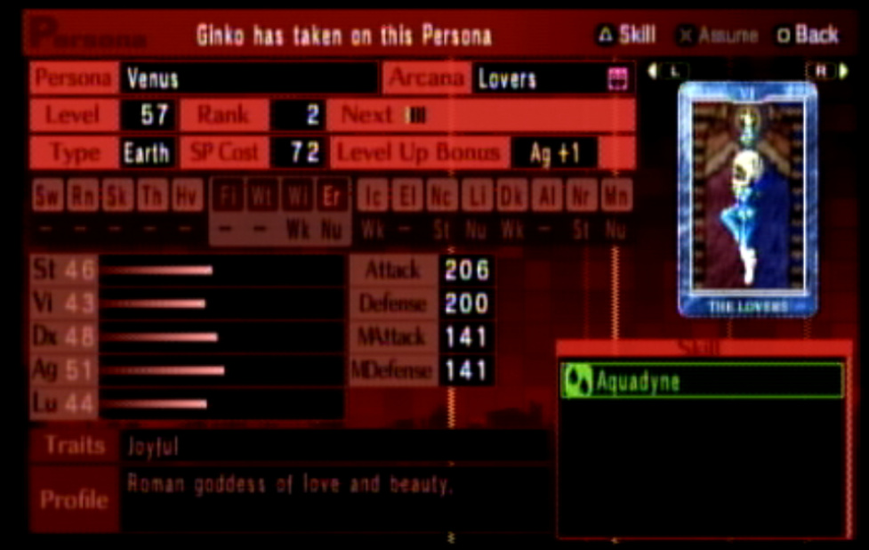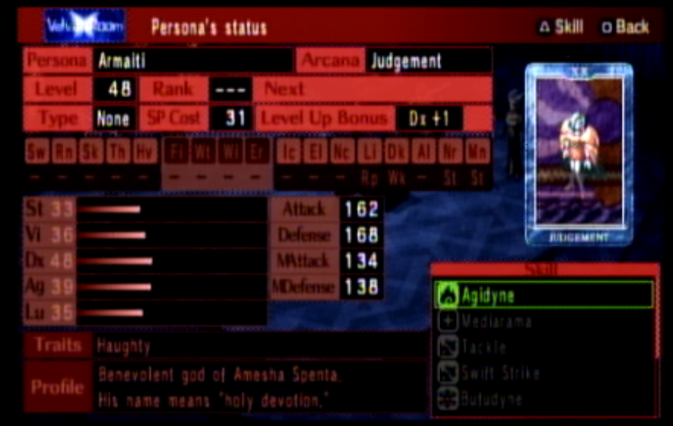 : In Persona 1, Pascal the Dog was a Persona I fused as a stopgap while grinding. In this game, he’s much better, though not as good as he is in Eternal Punishment. While his moveset may look kinda garbage (given that he’s still using Tier 2 spells at level 51), High Pressure is a skill used in a two-person fusion spell that’s actually pretty good, plus he still supports Meltdown.