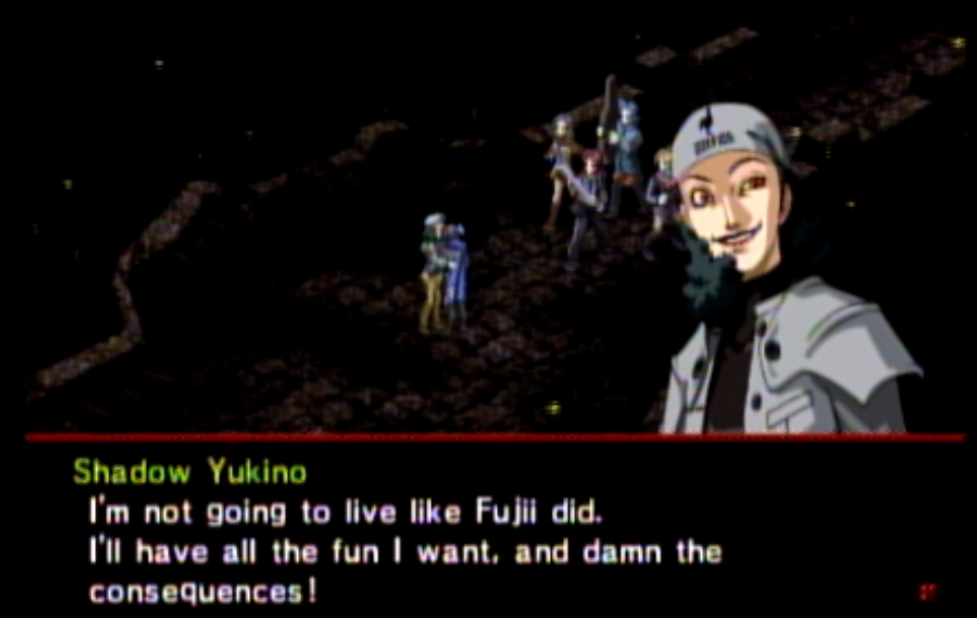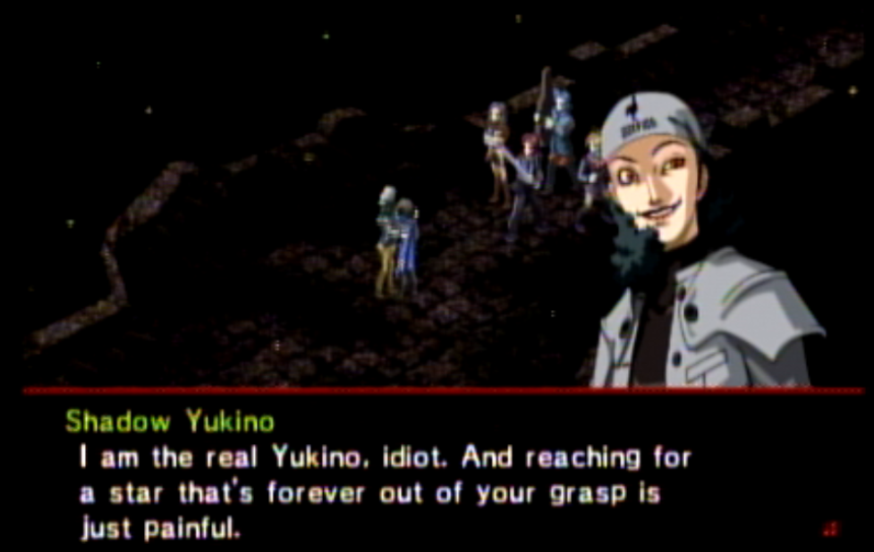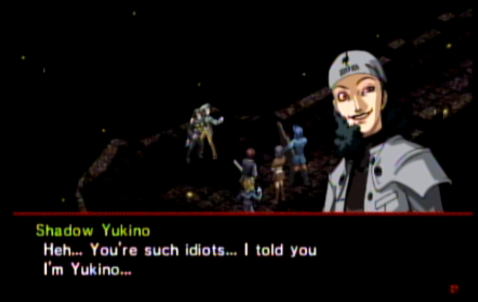 : Somehow, Yukino has a Shadow. I’d like to point out that the other games in the series have since established that having the ability to summon a Persona means you cannot have a Shadow clone - the Persona is only granted when you’ve accepted that your Shadow exists. This is one of many reasons this cutscene is not canon.. apart from one thing.