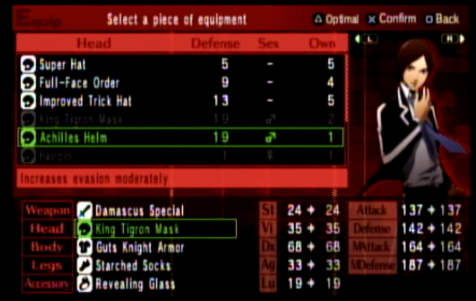 : The Achilles Helm increases evasion but is otherwise identical to the ones bought from the store. Since Tatsuya is already a tank I put it on Eikichi because it’s male-only and we only have one other male character.