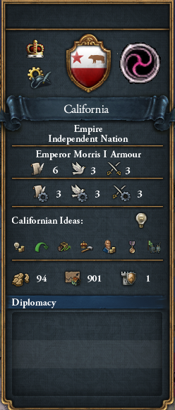 Peace returns to California, one where Emperor Thao I is the undisputed ruler of the Golden State. With his popularity at an all time high and a competent and loyal bureaucracy at his beck and call, it seems as though nothing can stop the rise of the new emperor.
