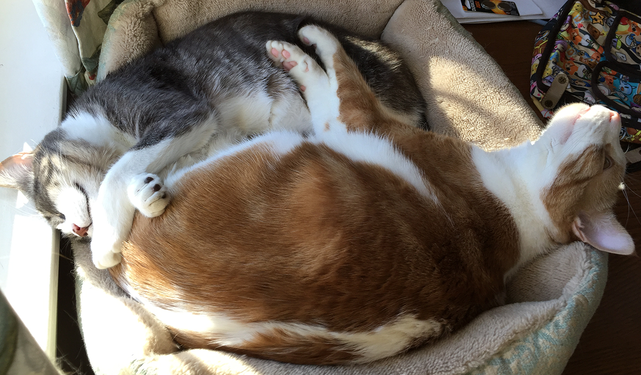 We found a kitten on highway 880, and thus dubbed him Nimitz. He was tiny at the time, probably only a couple weeks old, but it turned out he’s some percentage Maine Coon and he became a big tank cat. Miles hates him and will go out of her way just to beat him up a bit, despite the fact that he’s easily twice her size; Nimitz is just a soft goofball and sits there and takes it, though.