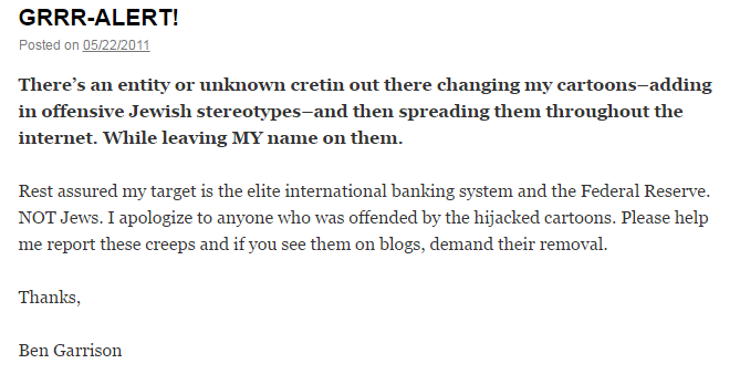 It looks to me like Ben Garrison is fine with a person’s cartoon being co-opted by Nazis and used to promote hate speech while leaving that person’s name and reputation on them…wait a minute…
