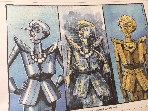 I will explain the last one, then. Theresa May (our current PM) is doing her best to evoke images of Margaret Thatcher (a previous PM who is regarded with extreme devotion by the Right and utter hatred by the Left). Thatcher was most often nicknamed “The Iron Lady”. However in recent showings leading up to the election May has made a pretty poor showing, leading few to regard her as a second Iron Lady. This is illustrated by showing the Iron Lady being caught in the rain. The rain turns her into wood, just like we all know happens to iron when it gets wet.