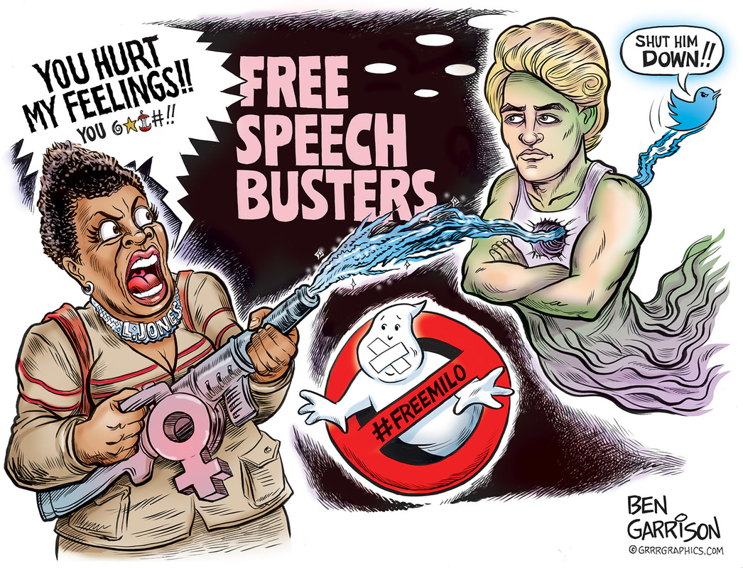 Milo, drawn as a muscular adonis, is looking stern but only slightly annoyed. Book publishers crying with exaggerated tears, holding Milo’s book that now has “CENSORED” written across it and saying some variant of “I’M OFFENDED.” People with brightly coloured hair labelled “feminists” and “sjws” are also there, pointing and crying, presented as literal babies. Milo is saying “Not an argument”. There will be literally no mention of the context behind the book-cancellation, and probably some racist and/or antisemitic imagery.