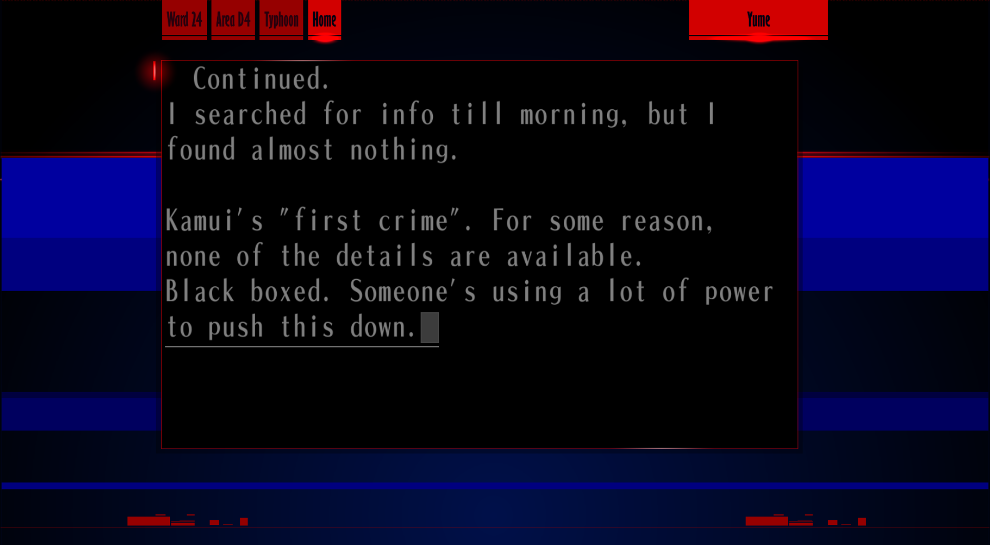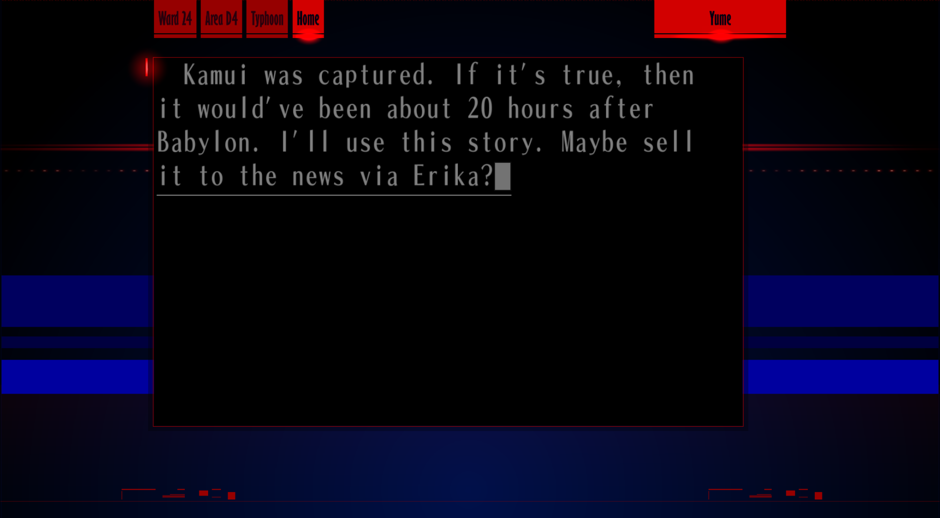 : “Oh, by the way… that night, I saw Hiruma on the street in front of the complex. I ride a motorcycle, you know? I didn’t talk to him or anything, and the parking lot’s in the back, so that’s it, but..”