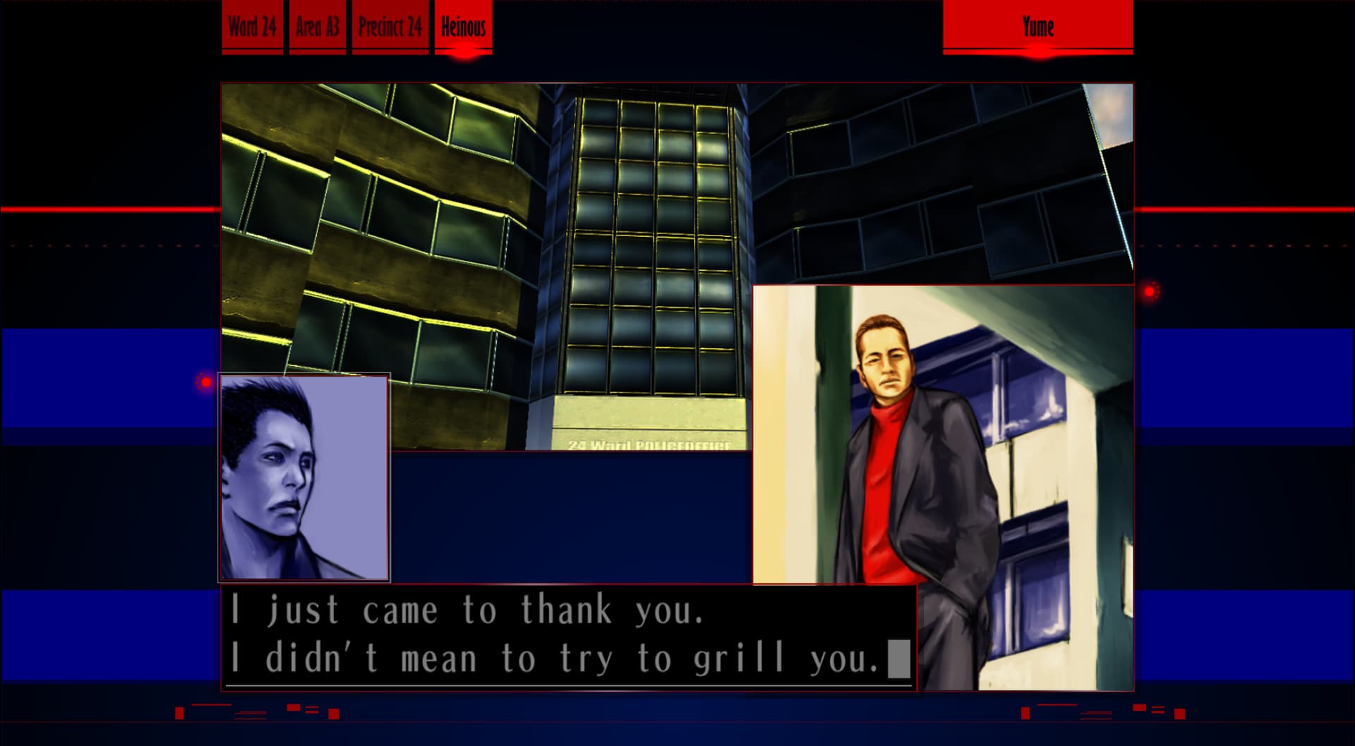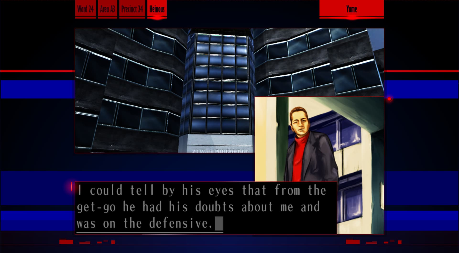 : “Ah, about the jumper from the other day, huh? Anything strange? Hm… I don’t think so… Oh yeah, I did hear a sound. Maybe that was the sound from when the guy jumped?”