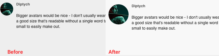 I’ll also be accepting comments in this topic regarding how large the avatars are (whether they’re too big, too small, or if you like them at their default size).