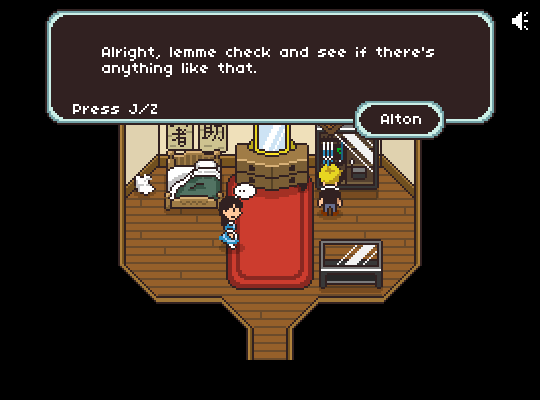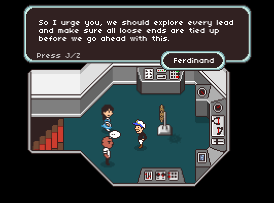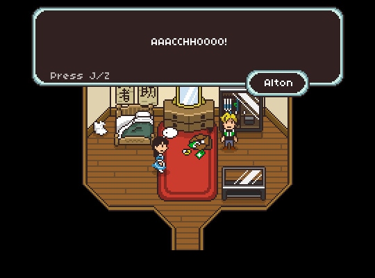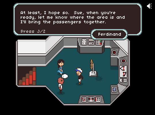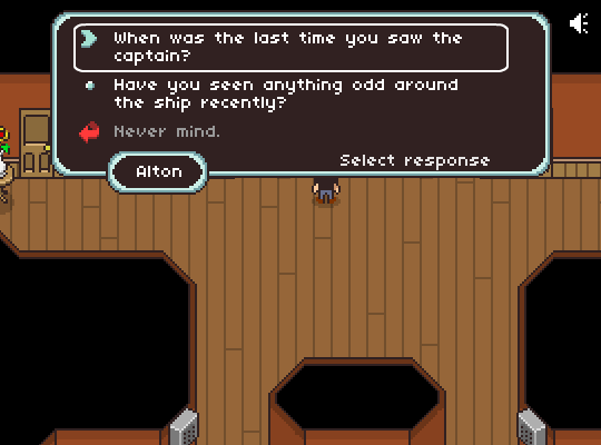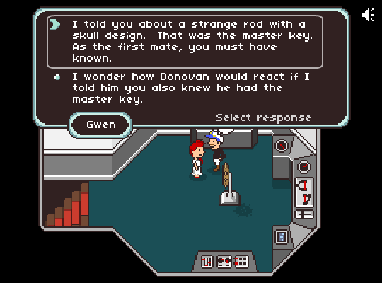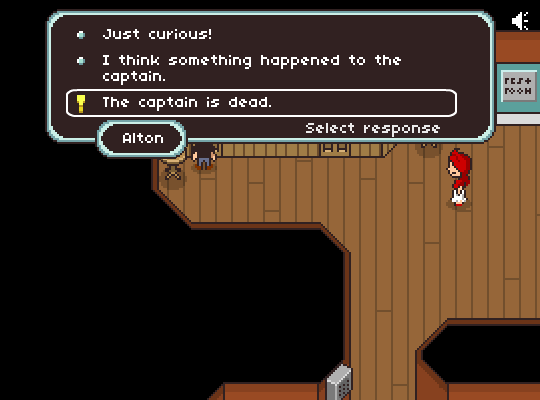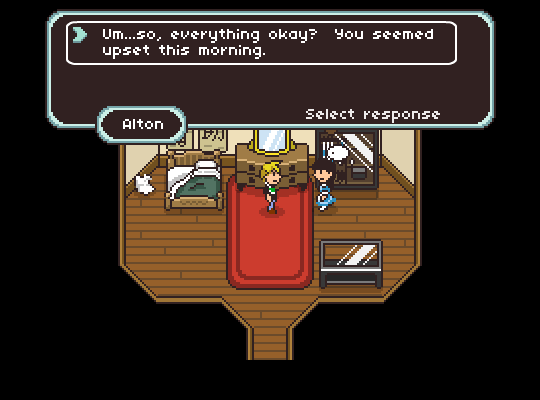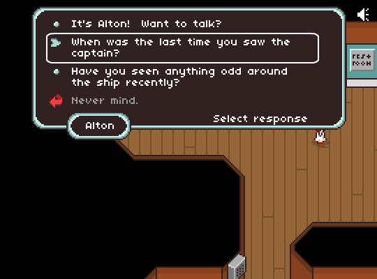Finally, the highest level of the ship is the bridge. I believe every character can come up here (which normally would be a massive security hazard on an actual ship) and look at stuff, but Alton won’t touch any of the controls. We don’t really have much else to do, so let’s go check out Sue and see what she’s doing.