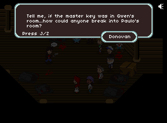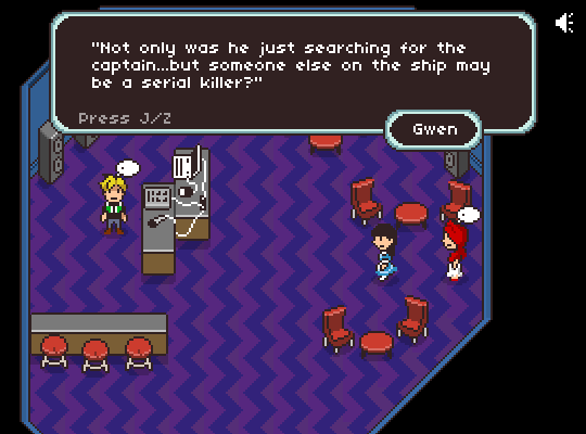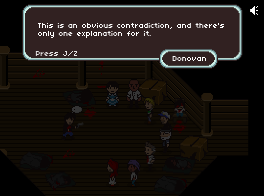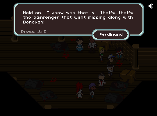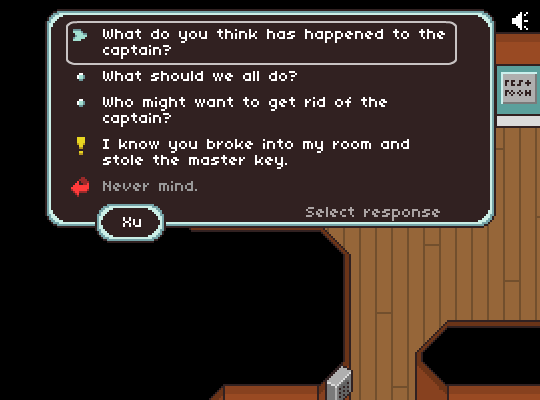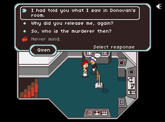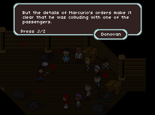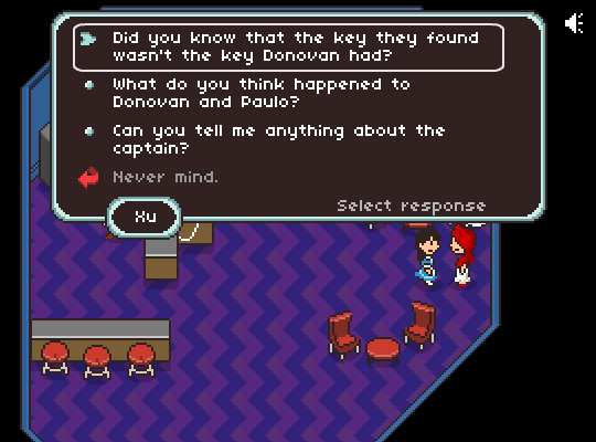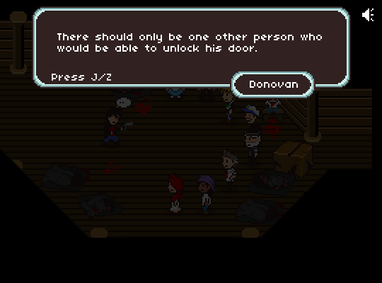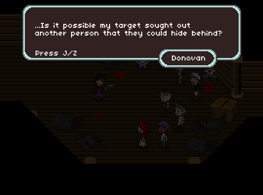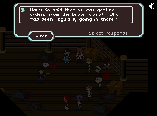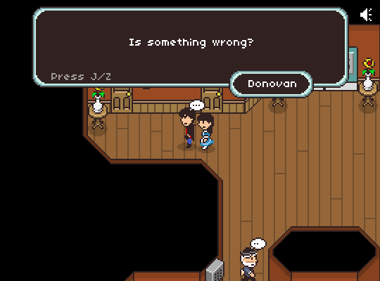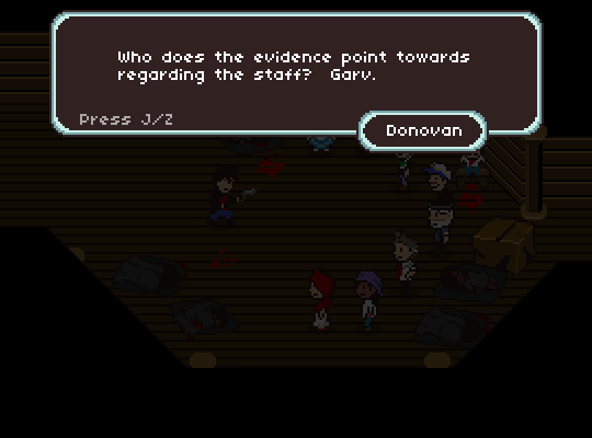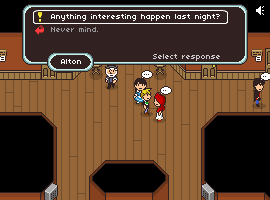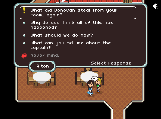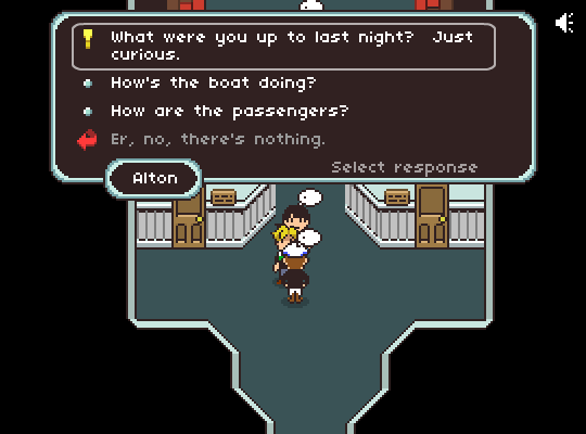 Our next victim is this guy. This is Donovan, and like Quella, he tends to roam around, mainly between his room and the hall. Unlike most of the people on the Douce Amere, Donovan keeps his room locked at all times, meaning he can be kind of a pain to find. Donovan doesn’t have any interesting optional dialogues (he’ll basically just try to get Alton to go away) but we do have to try asking him what he was doing last night.