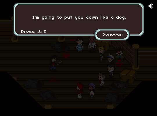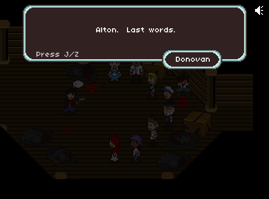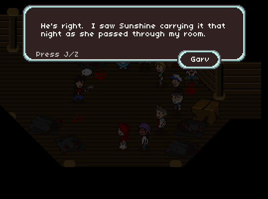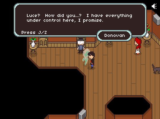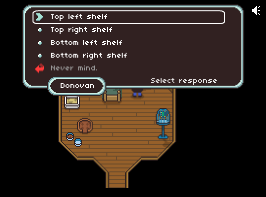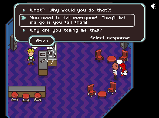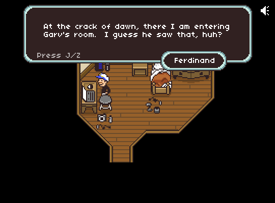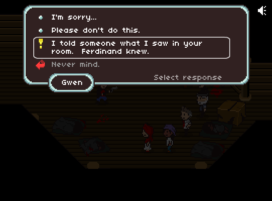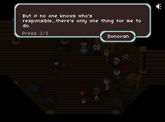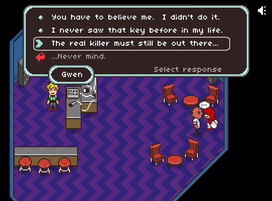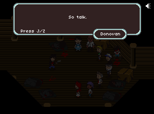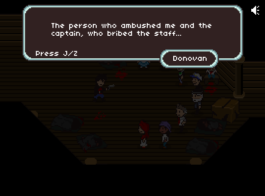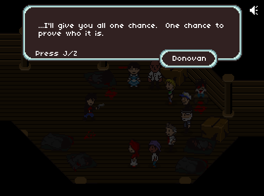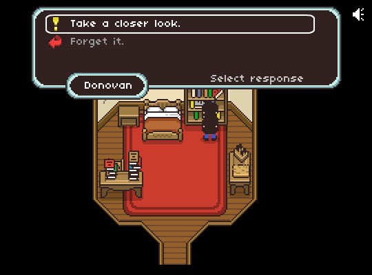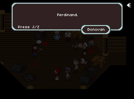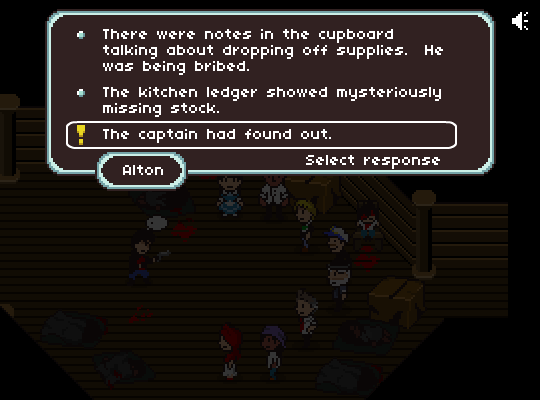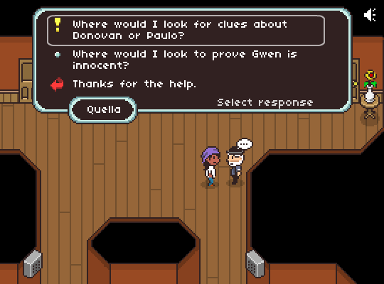 Our next victim is this guy. This is Donovan, and like Quella, he tends to roam around, mainly between his room and the hall. Unlike most of the people on the Douce Amere, Donovan keeps his room locked at all times, meaning he can be kind of a pain to find. Donovan doesn’t have any interesting optional dialogues (he’ll basically just try to get Alton to go away) but we do have to try asking him what he was doing last night.