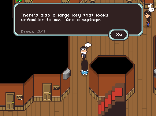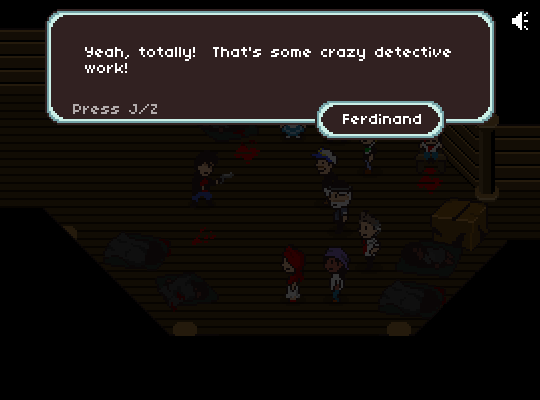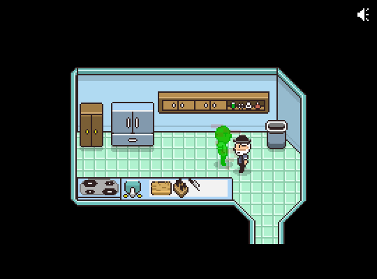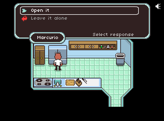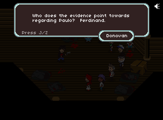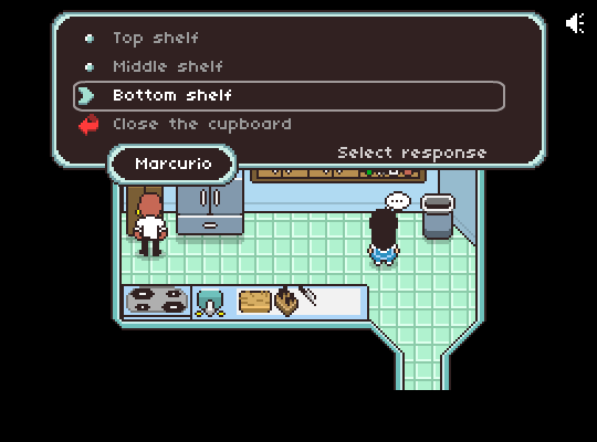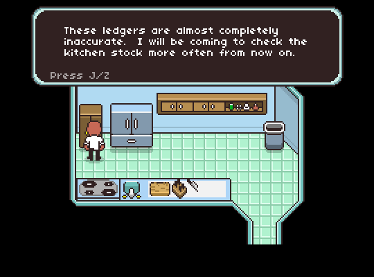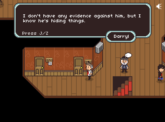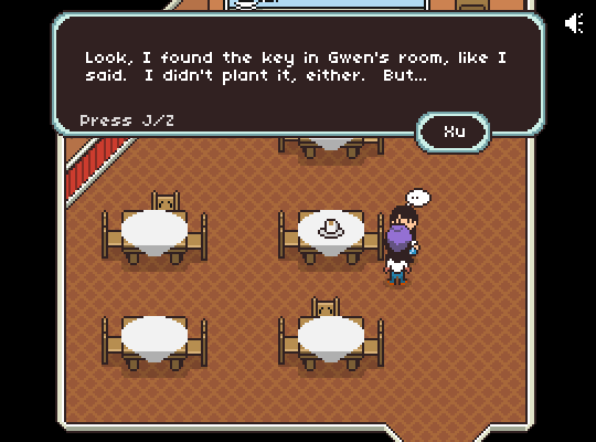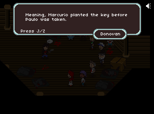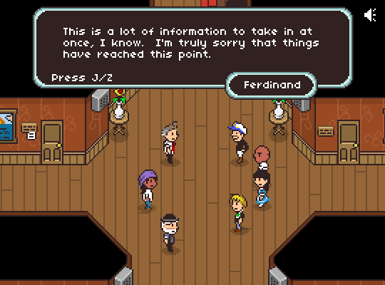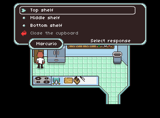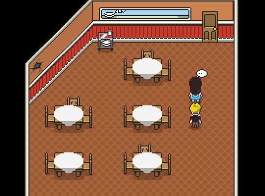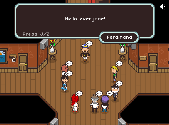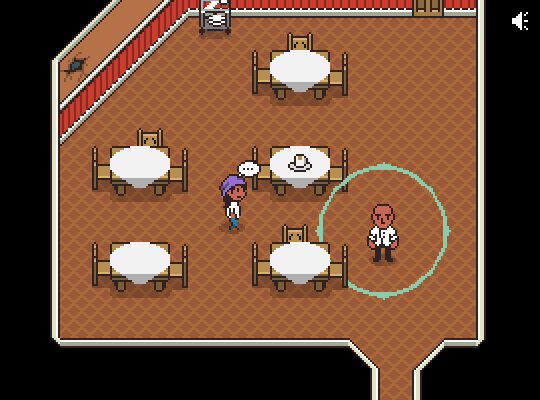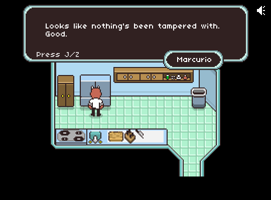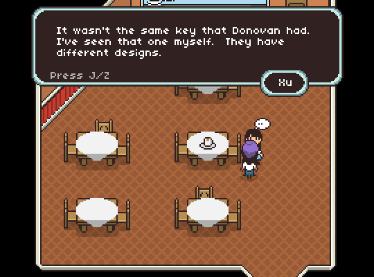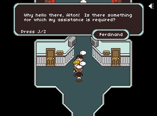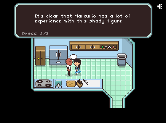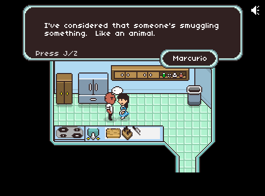 Now that we’re done questioning Ferdinand, we can go to the kitchen and talk to Marcurio. Strangely, any one of the possessable characters can enter the kitchen straight up. It hasn’t been said outright yet, but Xu is basically Marcurio’s assistant - so she at least has a reason to go in there.