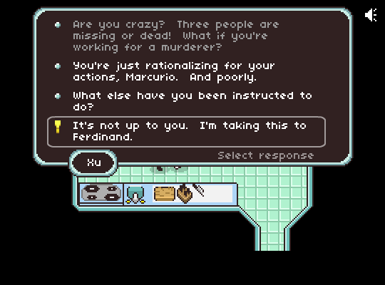 Now that we’ve gone through all of Xu’s dialogue, a new option pops up. Like Snatcher or Policenauts, a lot of this game revolves around exhausting dialogue.