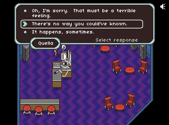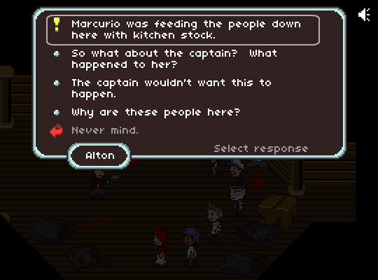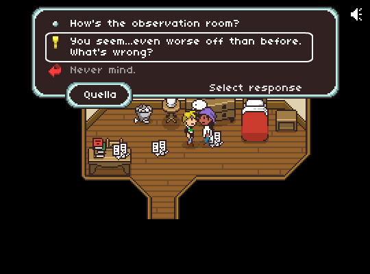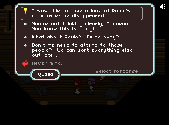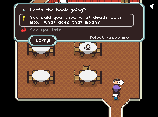 I haven’t mentioned it yet, but this game is really, really nice about how it handles conversations. Anything marked with an exclamation point is necessary to advance the plot, with everything else being optional. However, for sake of completeness and because these characters are actually pretty well-written, I’m going to include all of the possible unique dialogue points. If you’re in a rush, or just reading this LP at work, feel free to skip them.