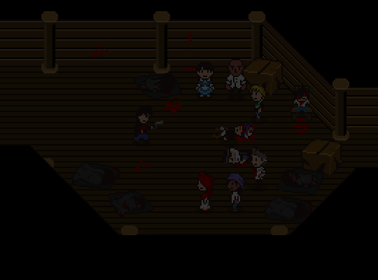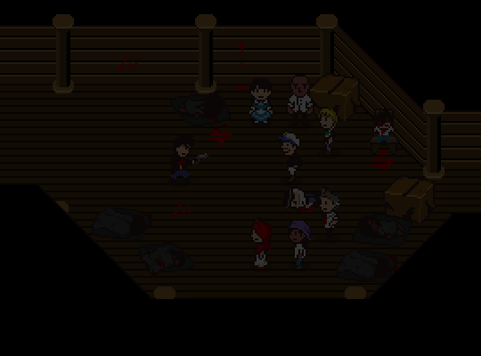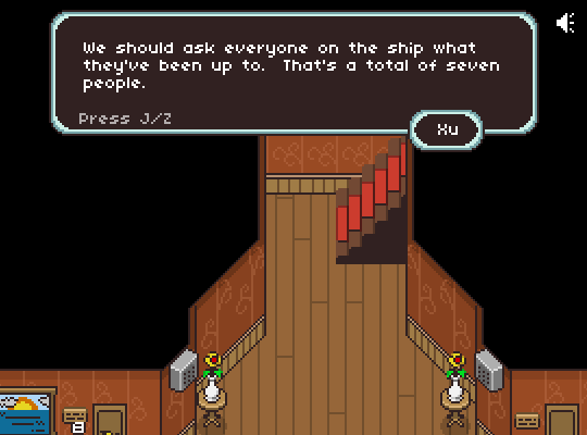And this is the upper deck. We’ll take Xu’s advice and head up to see Marcurio first. Ferdinand and Darryl should still be up there as well, so we can get three of the seven suspects out of the way at once. Note that there are more than 7 people on the boat: no one seems to know that Paulo is aboard, so he’s not counted.