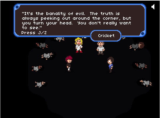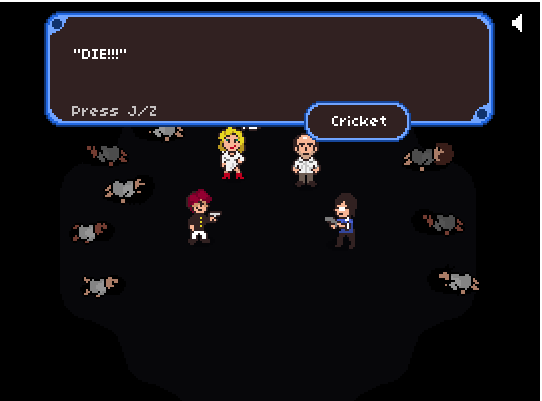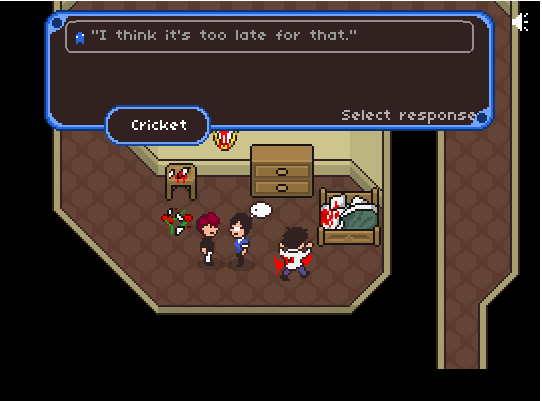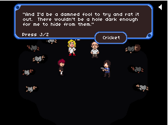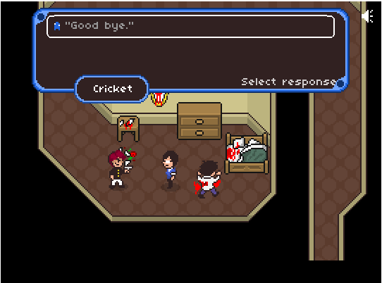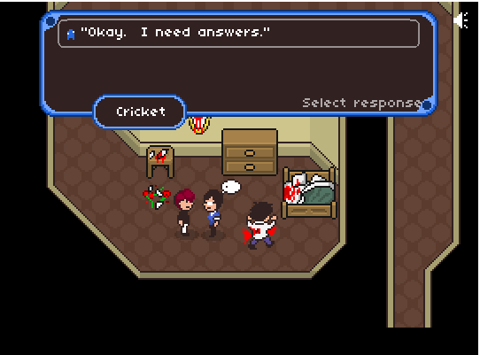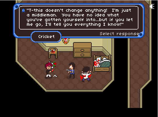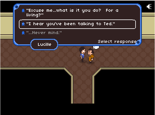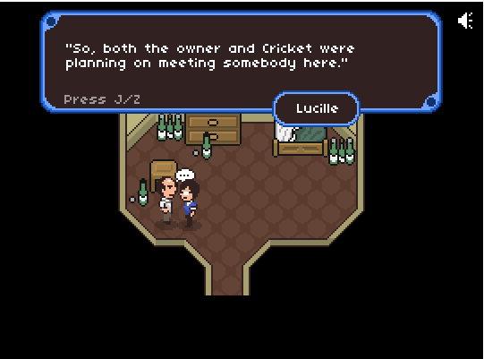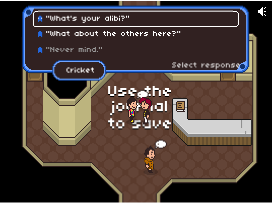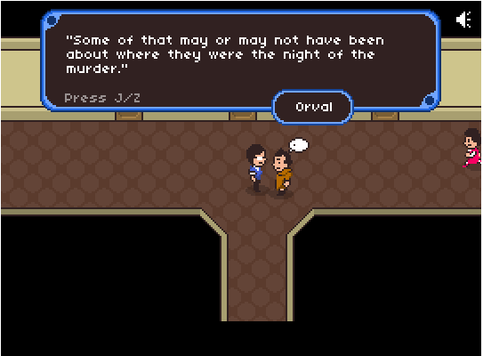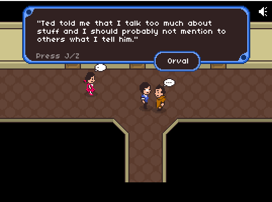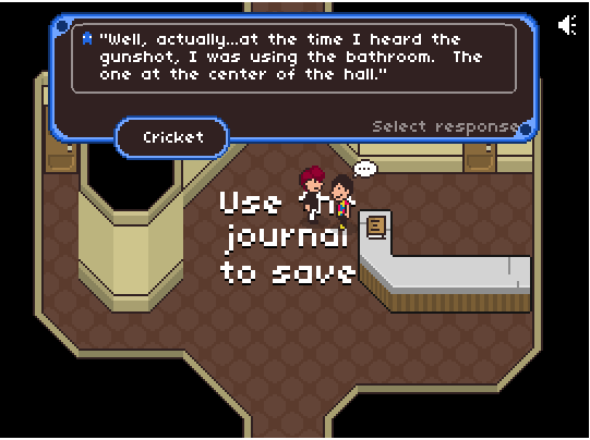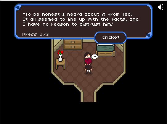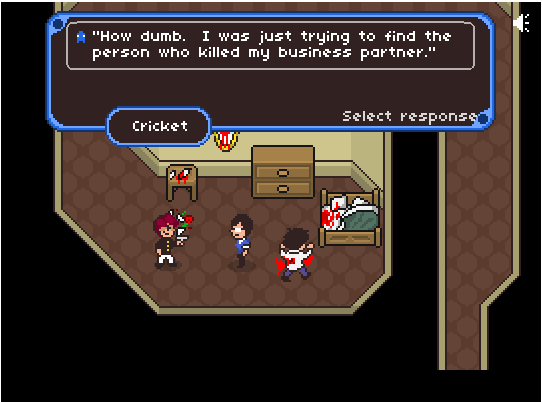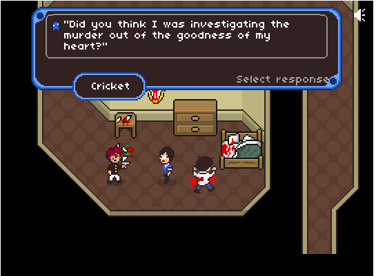: “No worries. So, uh, how long have you been in there?” : “…” : “Okay, maybe that was the wrong kind of question. That came out pretty weird.” : “Yeah, it did.” : “I ask because there’s a guy who says he was here during the murder, and that you can back up his story.” : “Oh, guy with the red hair? He was here.” : “I was having a bit of a night-time emergency and he was using the bathroom at the time.” : “Not sure what he was doing, but he was taking a long time and refusing to get out.” : “Sort of like you, right now?” : “Maybe we ate the same thing. When we were in the middle of switching ‘shifts’, as it were, there was a gunshot.” : “I wasn’t in any position to go check it out at the time. Don’t know what the redhead did.”Now that we’ve confirmed Cricket’s alibi for Ted, we can get him to narrow down our list of suspects.