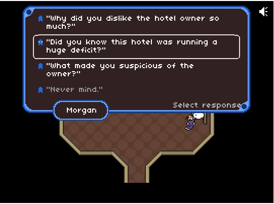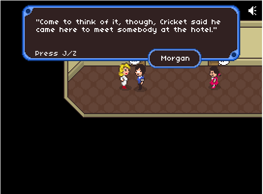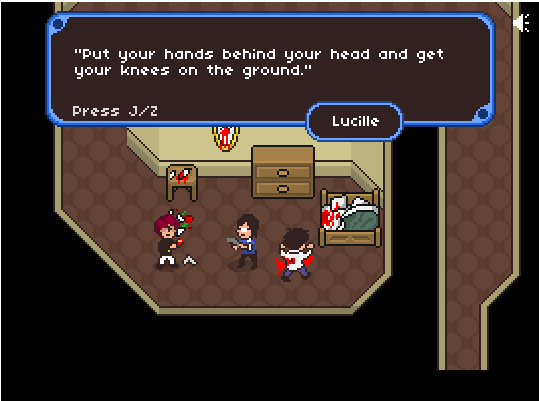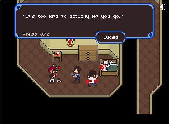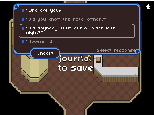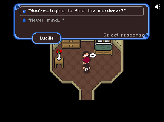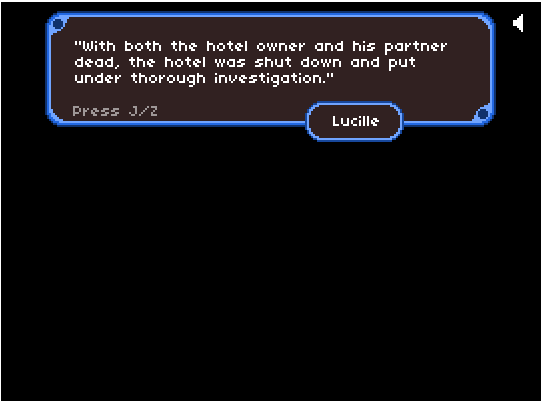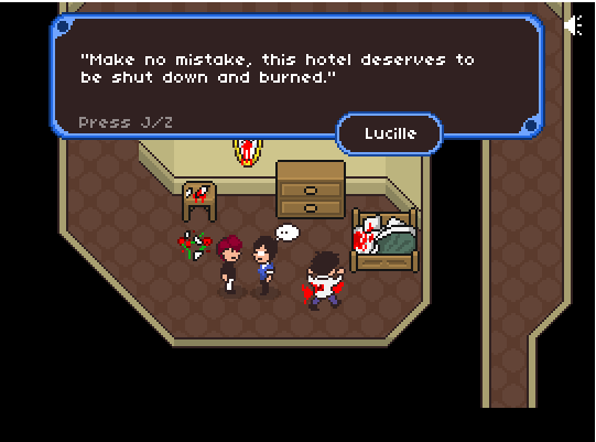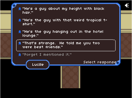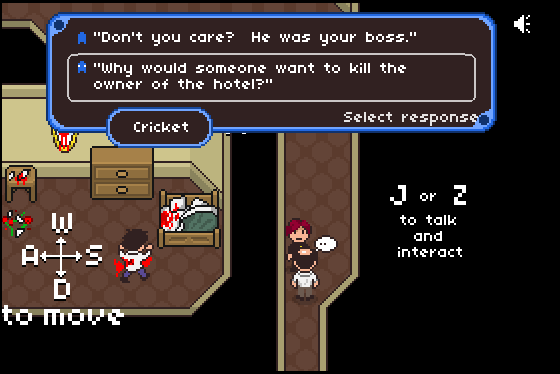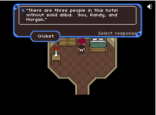 : “That’s what cops do. And I’m not a cop.” : “We already called 911. Leave it at that.” : “But with the storm that’s going on, nobody will make it here for weeks.”There are vague thunderstorm noises that play throughout the hotel (which is one of the reasons I didn’t just do a stream of this and call it a day) for pretty much the entire playthrough. There’s also this kind of annoying transition sound that I think the dev took from 24 or CSI or something that plays every time you enter a room.