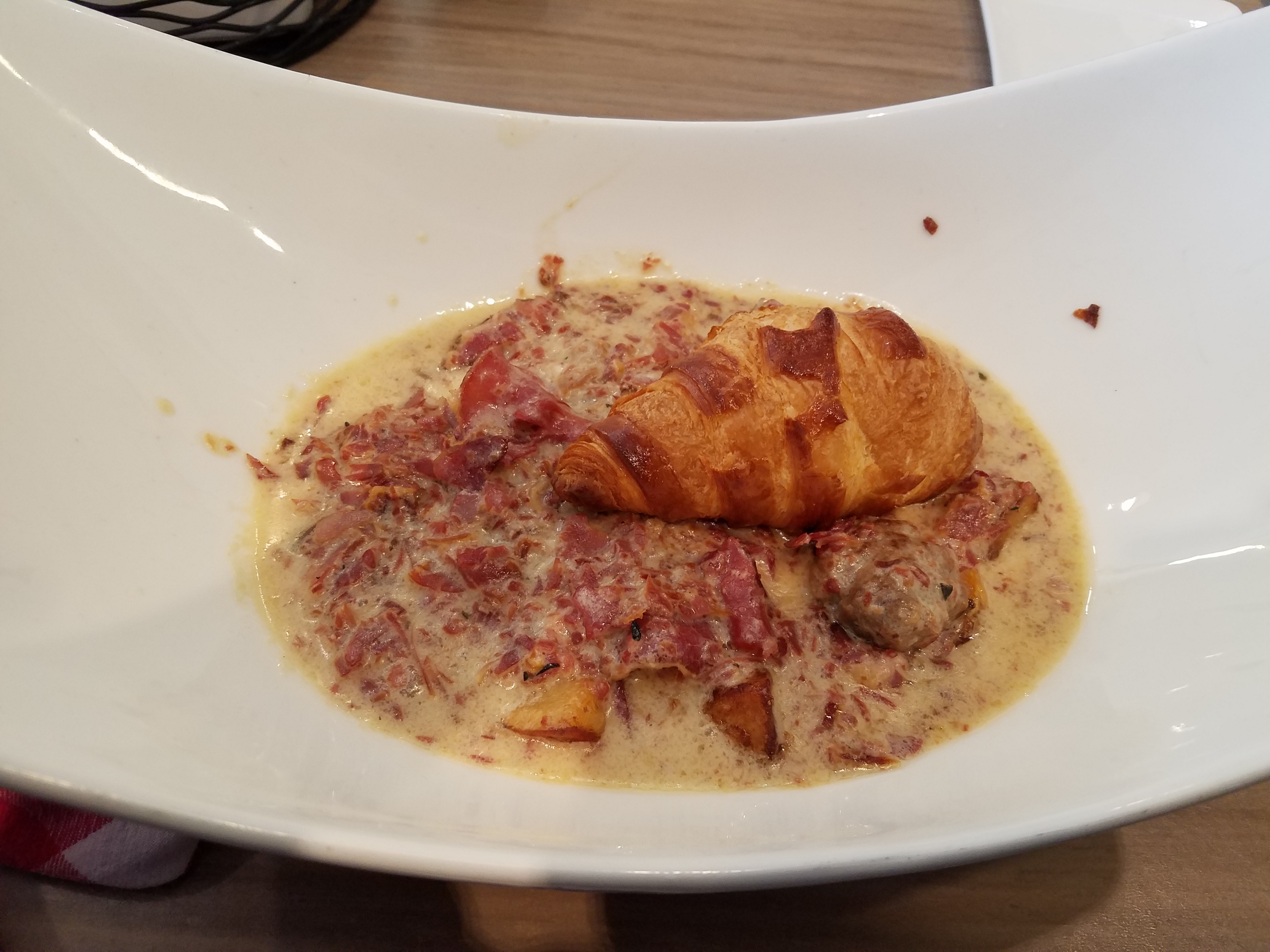 Tonight we had what would happen if you made a from-scratch baked macaroni & cheese but instead of macaroni you used brussels sprouts. We did this on purpose believe it or not, because it’s much lower calorie that way and that’s something we unfortunately have to be conscious of due to holiday binging.