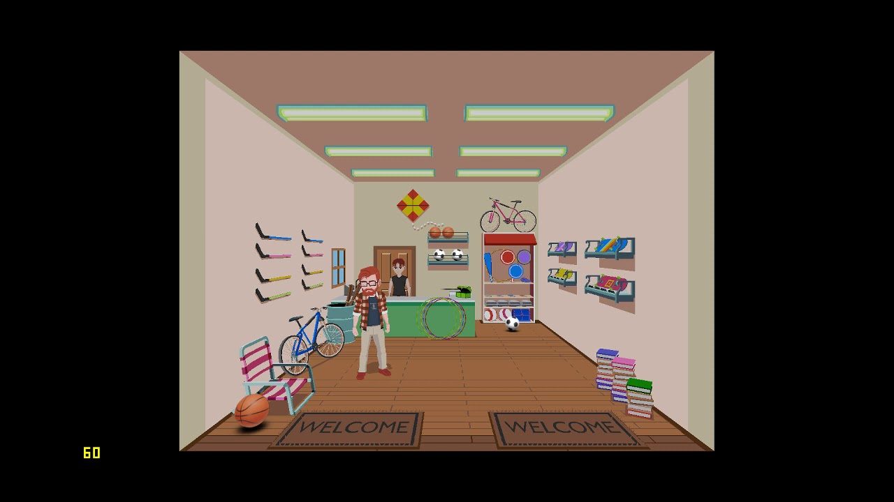 : This part is particularly fucking egregious. See how there’s stores here? We can’t go in any of them until we’ve gone to Burger Joint. You can’t see it very well, but right next to the “Toys & Sports” store is the Planet VHS Rory ostensibly works at. Worse, after we do the Burger Joint cutscene, we STILL can’t go in any of the stores except the Record Stop next door.